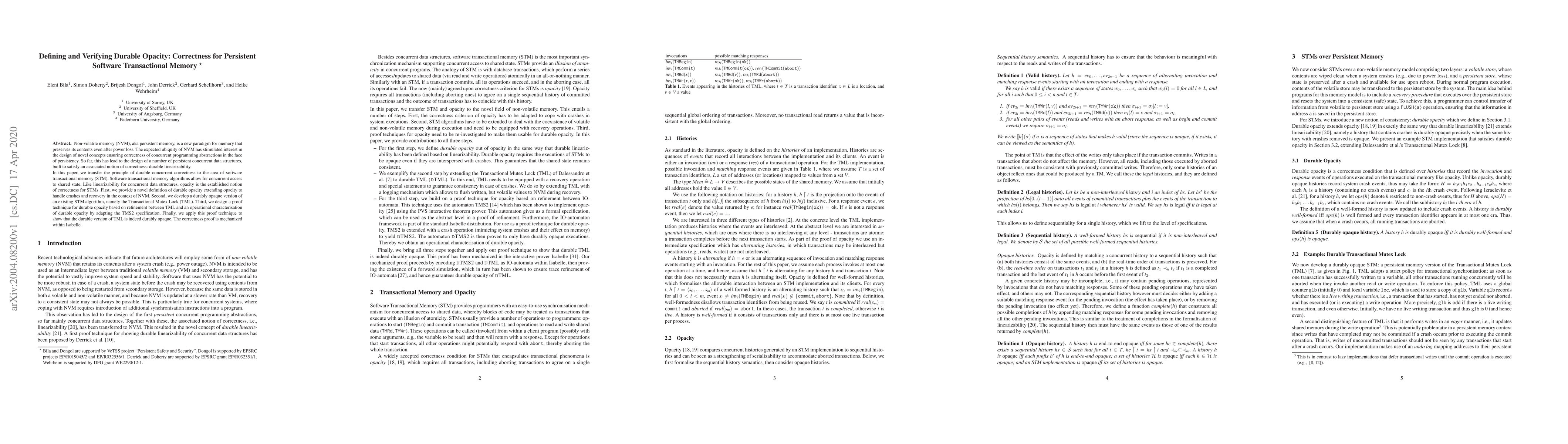This paper introduces a novel definition of durable opacity to ensure correctness for persistent software transactional memory (STM) in non-volatile memory contexts. It develops a durably opaque version of the Transactional Mutex Lock (TML) and proves its correctness using a mechanized proof technique within Isabelle.