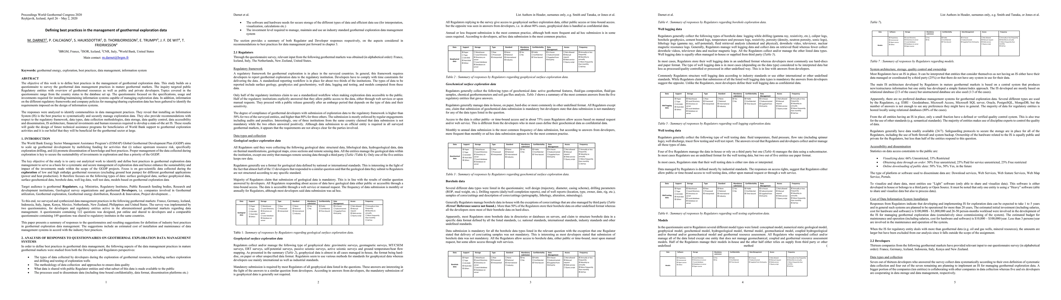 The objective of this work is to define best practices in the management of geothermal exploration data. This study builds on a questionnaire to survey the geothermal data management practices in mature geothermal markets. The inquiry targeted public Regulatory entities with overview of geothermal resources as well as public and private developers. Topics covered in the questionnaire range from the country status to the database set up. The questionnaire focused on the specifications, usage and investments required for installing/maintaining information systems capable of managing exploration data. In addition, information on the different regulatory frameworks and company policies for managing/sharing exploration data has been gathered to identify the requirements imposed on the design of information systems. The responses were analyzed to identify commonalities in data management practices. They reveal that installing an Information System (IS) is the best practice to systematically and securely manage exploration data. They also provide recommendations with respect to the regulatory framework, data types, data collection methodologies, data storage, data quality control, data accessibility and dissemination, IS architecture, financial investments and human resources required to develop a state-of-the art IS. These results will guide the design of future technical assistance programs for beneficiaries of World Bank support to geothermal exploration activities and it is our belief that they will be beneficial for the geothermal sector at large.