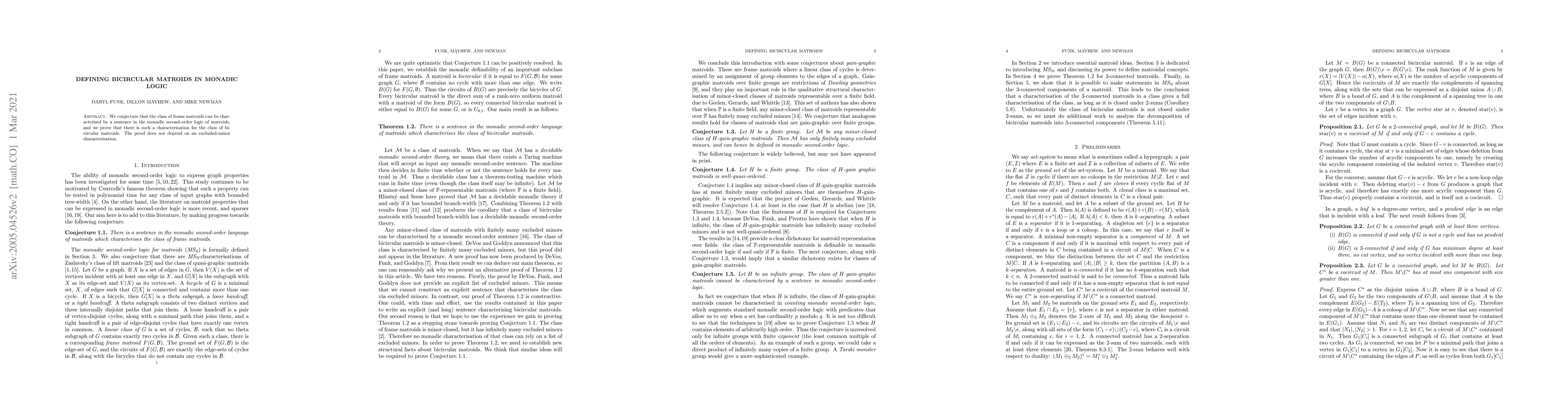 This paper proposes a monadic second-order logic sentence to characterize bicircular matroids, proving their distinction within the class of frame matroids without relying on excluded-minor criteria. The study focuses on formalizing the properties of bicircular matroids using logic-based definitions.