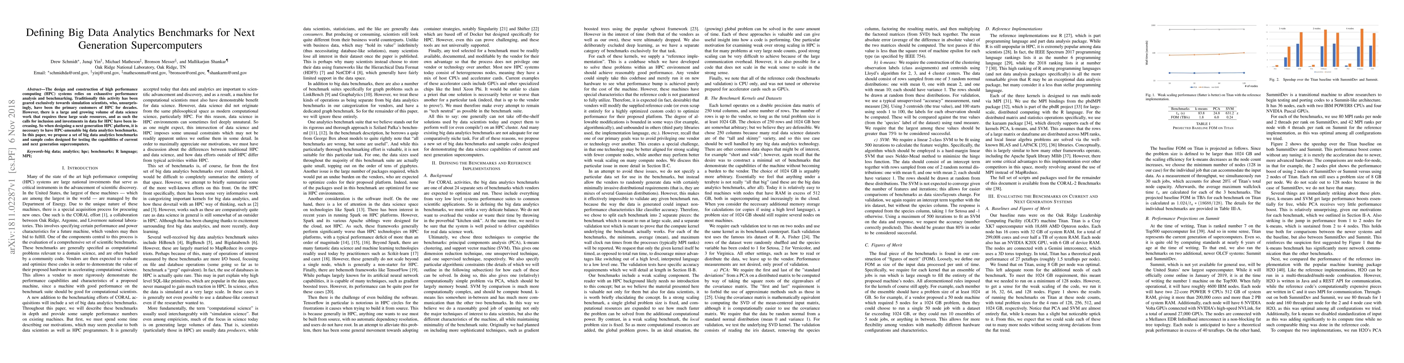 The design and construction of high performance computing (HPC) systems relies on exhaustive performance analysis and benchmarking. Traditionally this activity has been geared exclusively towards simulation scientists, who, unsurprisingly, have been the primary customers of HPC for decades. However, there is a large and growing volume of data science work that requires these large scale resources, and as such the calls for inclusion and investments in data for HPC have been increasing. So when designing a next generation HPC platform, it is necessary to have HPC-amenable big data analytics benchmarks. In this paper, we propose a set of big data analytics benchmarks and sample codes designed for testing the capabilities of current and next generation supercomputers.