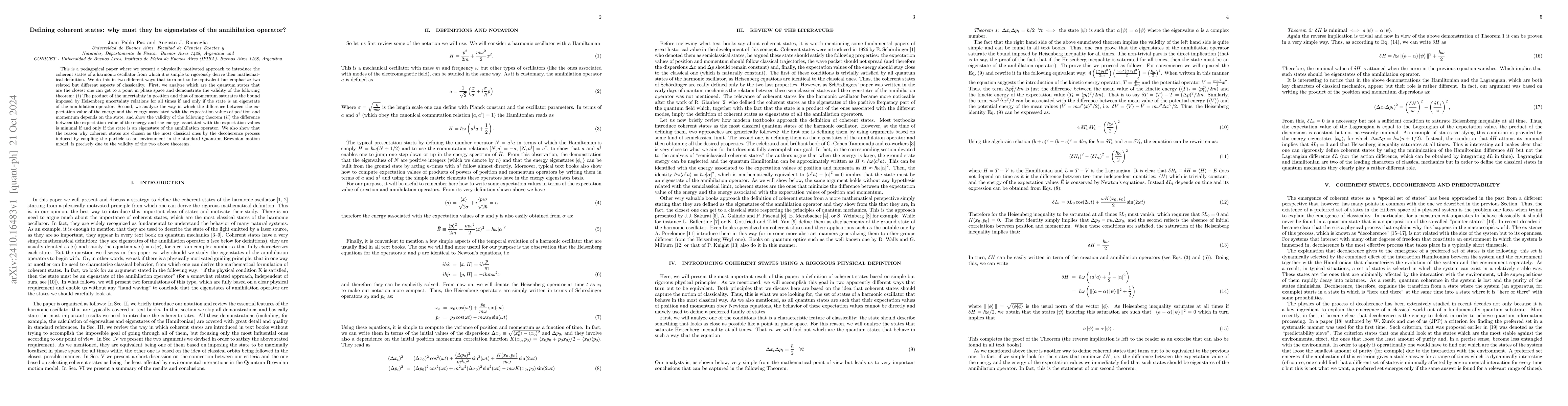 This is a pedagogical paper where we present a physically motivated approach to introduce the coherent states of a harmonic oscillator from which it is simple to rigorously derive their mathematical definition. We do this in two different ways that turn out to be equivalent but emphasize two related but different aspects of classicality. First, we analyze which are the quantum states that are the closest one can get to a point in phase space and demonstrate the validity of the following theorem: (i) The product of the uncertainty in position and that of momentum saturates the bound imposed by Heisenberg uncertainty relations for all times if and only if the state is an eigenstate of the annihilation operator. Second, we analyze the way in which the difference between the expectation value of the energy and the energy associated with the expectation values of position and momentum depends on the state, and show the validity of the following theorem (ii) the difference between the expectation value of the energy and the energy associated with the expectation values is minimal if and only if the state is an eigenstate of the annihilation operator. We also show that the reason why coherent states are chosen as the most classical ones by the decoherence process induced by coupling the particle to an environment in the standard Quantum Brownian motion model, is precisely due to the validity of the two above theorems.