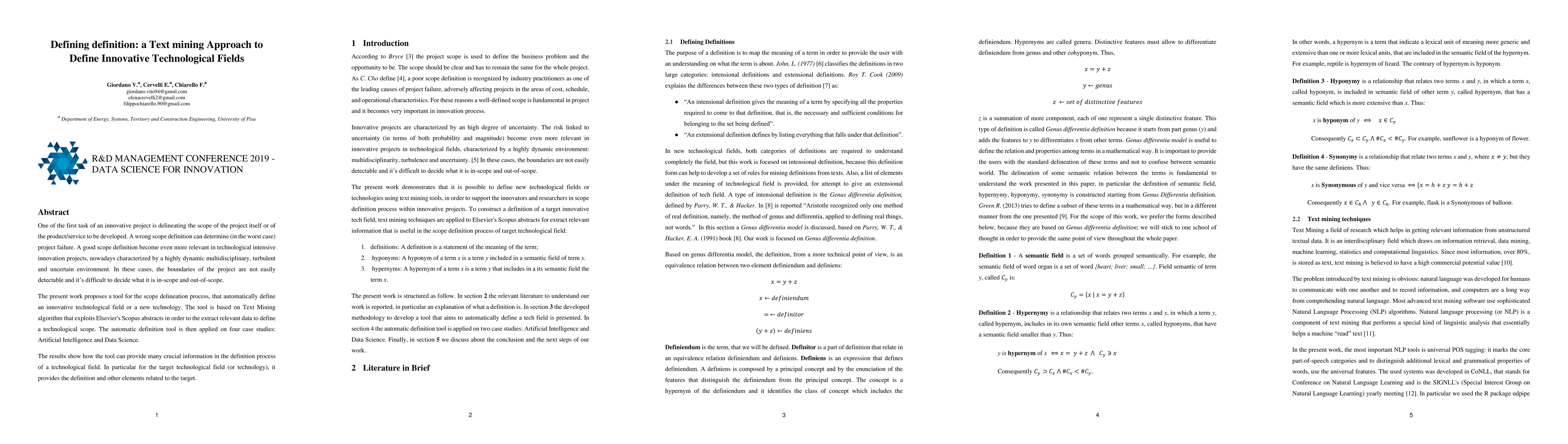 A Text Mining approach helps define innovative technological fields by automatically extracting relevant data from Elsevier's Scopus abstracts to determine the scope of a project or product. The tool provides crucial information for defining a technological field, including its definition and related elements.