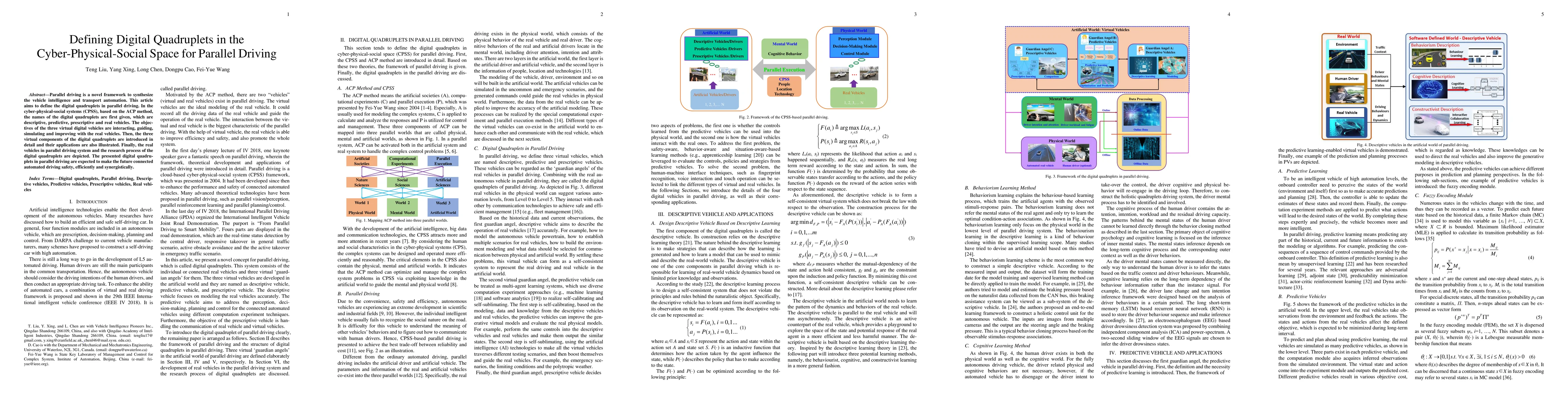Parallel driving is a novel framework to synthesize vehicle intelligence and transport automation. This article aims to define digital quadruplets in parallel driving. In the cyber-physical-social systems (CPSS), based on the ACP method, the names of the digital quadruplets are first given, which are descriptive, predictive, prescriptive and real vehicles. The objectives of the three virtual digital vehicles are interacting, guiding, simulating and improving with the real vehicles. Then, the three virtual components of the digital quadruplets are introduced in detail and their applications are also illustrated. Finally, the real vehicles in the parallel driving system and the research process of the digital quadruplets are depicted. The presented digital quadruplets in parallel driving are expected to make the future connected automated driving safety, efficiently and synergistically.
