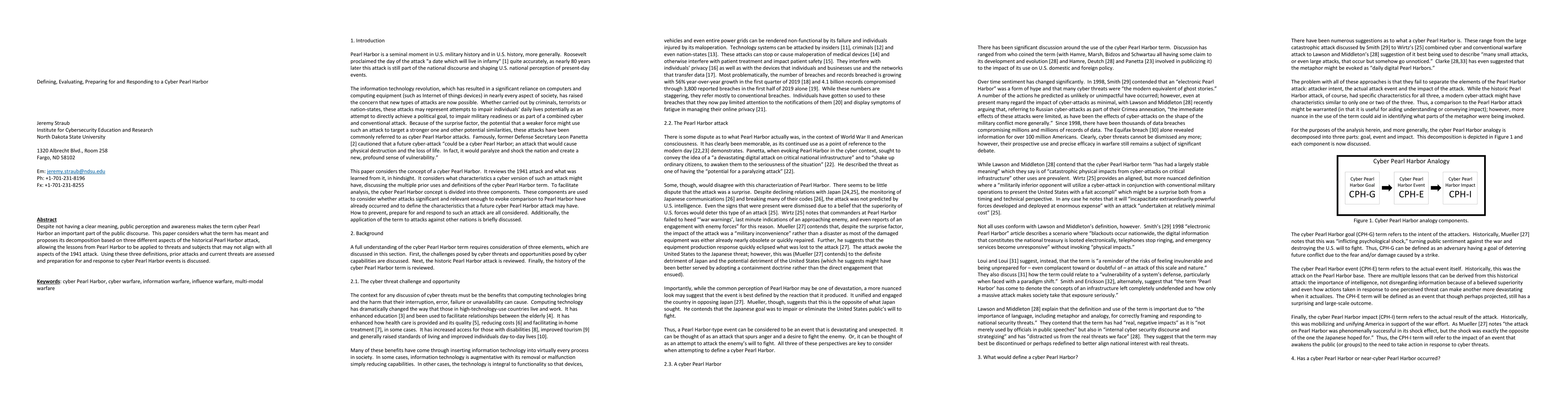 This paper defines "cyber Pearl Harbor" based on three aspects of the Pearl Harbor attack, evaluates past and current cyber threats through these lenses, and discusses strategies for preparing and responding to such future cyber incidents.