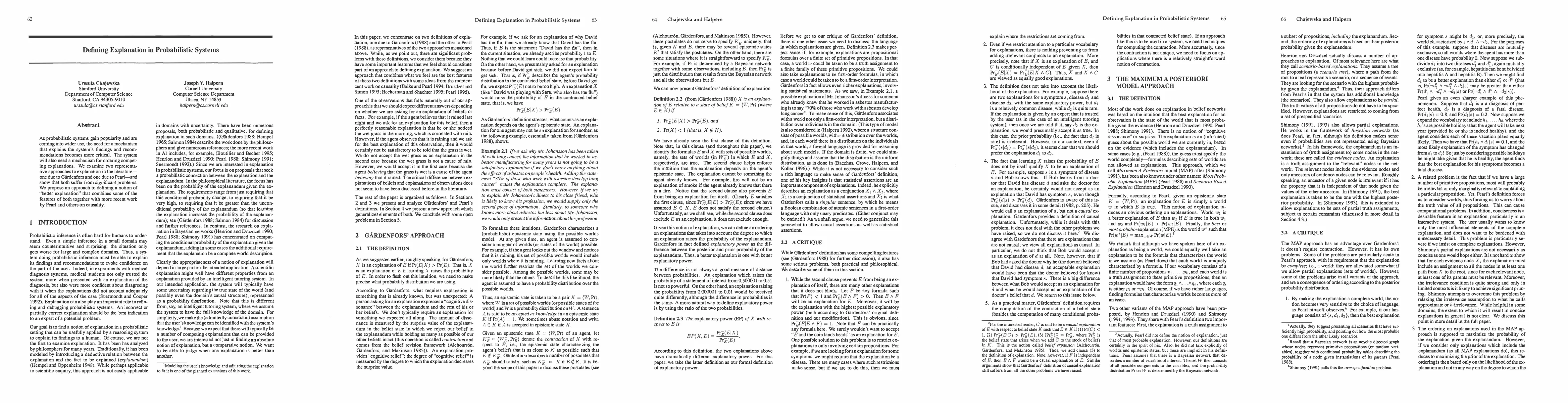As probabilistic systems gain popularity and are coming into wider use, the need for a mechanism that explains the system's findings and recommendations becomes more critical. The system will also need a mechanism for ordering competing explanations. We examine two representative approaches to explanation in the literature - one due to G\"ardenfors and one due to Pearl - and show that both suffer from significant problems. We propose an approach to defining a notion of "better explanation" that combines some of the features of both together with more recent work by Pearl and others on causality.