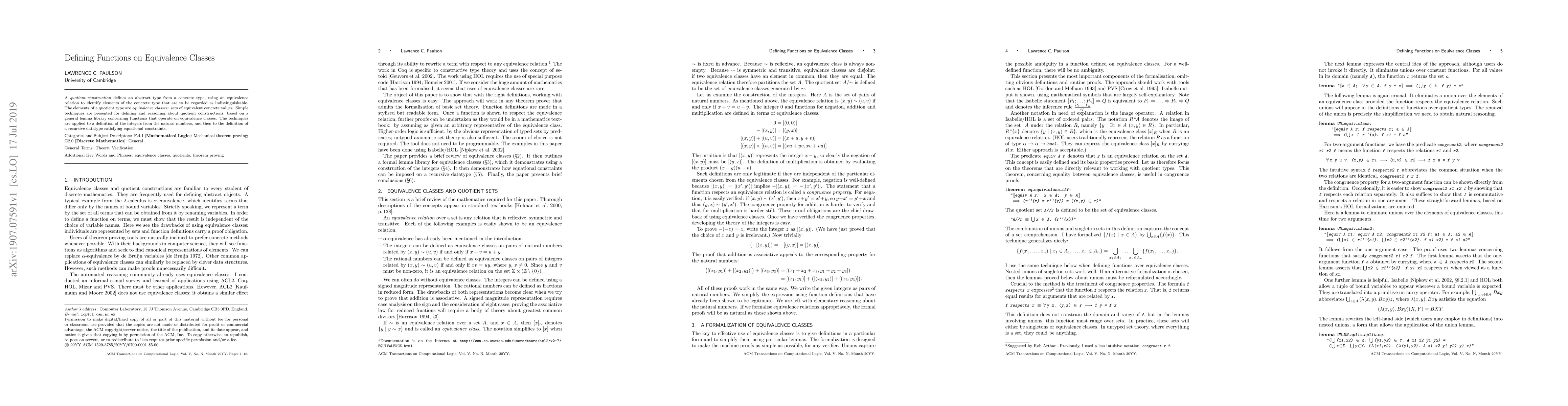 This paper introduces a quotient construction to define abstract types from concrete ones using equivalence relations, providing techniques for defining and reasoning about quotient constructions. It applies this approach to defining integers from natural numbers and recursive datatypes with equational constraints.