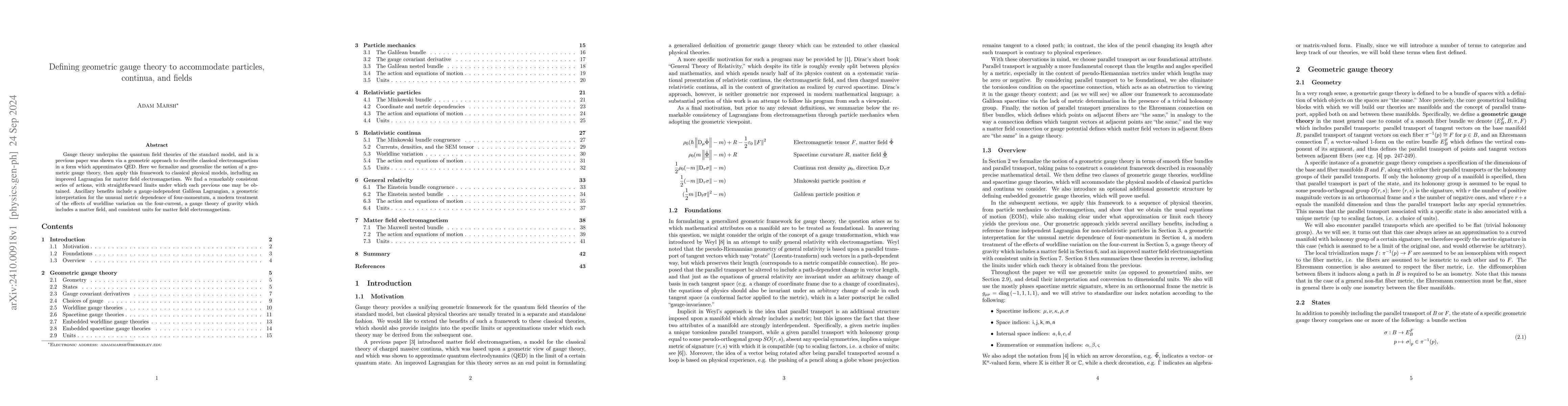 Gauge theory underpins the quantum field theories of the standard model, and in a previous paper was shown via a geometric approach to describe classical electromagnetism in a form which approximates QED. Here we formalize and generalize the notion of a geometric gauge theory, then apply this framework to classical physical models, including an improved Lagrangian for matter field electromagnetism. We find a remarkably consistent series of actions, with straightforward limits under which each previous one may be obtained. Ancillary benefits include a gauge-independent Galilean Lagrangian, a geometric interpretation for the unusual metric dependence of four-momentum, a modern treatment of the effects of worldline variation on the four-current, a gauge theory of gravity which includes a matter field, and consistent units for matter field electromagnetism.