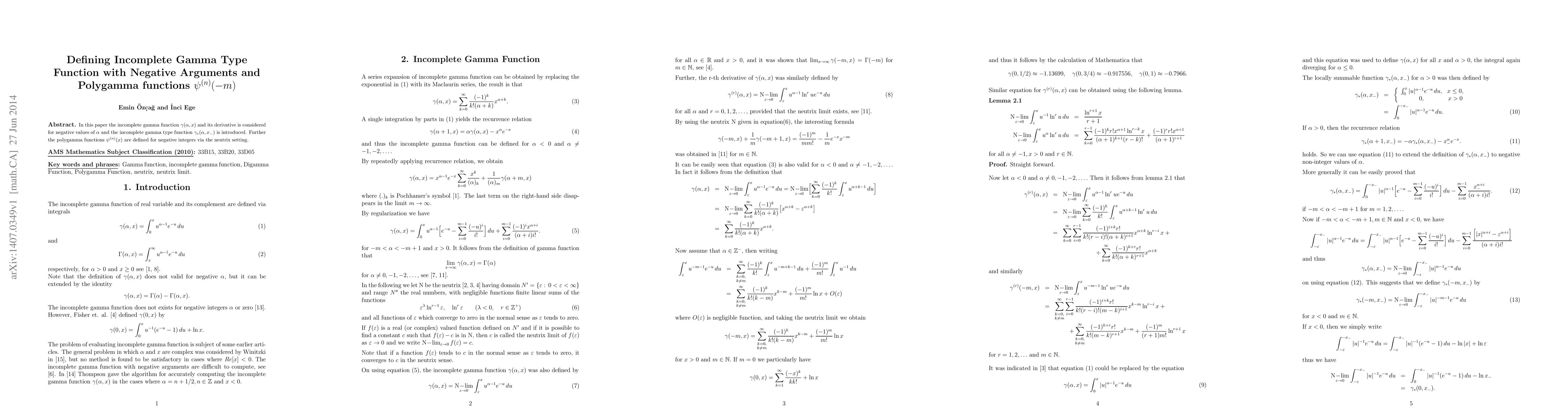 This paper introduces the incomplete gamma type function $\gamma_*(\alpha,x_-)$ for negative $\alpha$ and extends the definition of polygamma functions $\psi^{(n)}(-m)$ to negative integers using the neutrix setting.