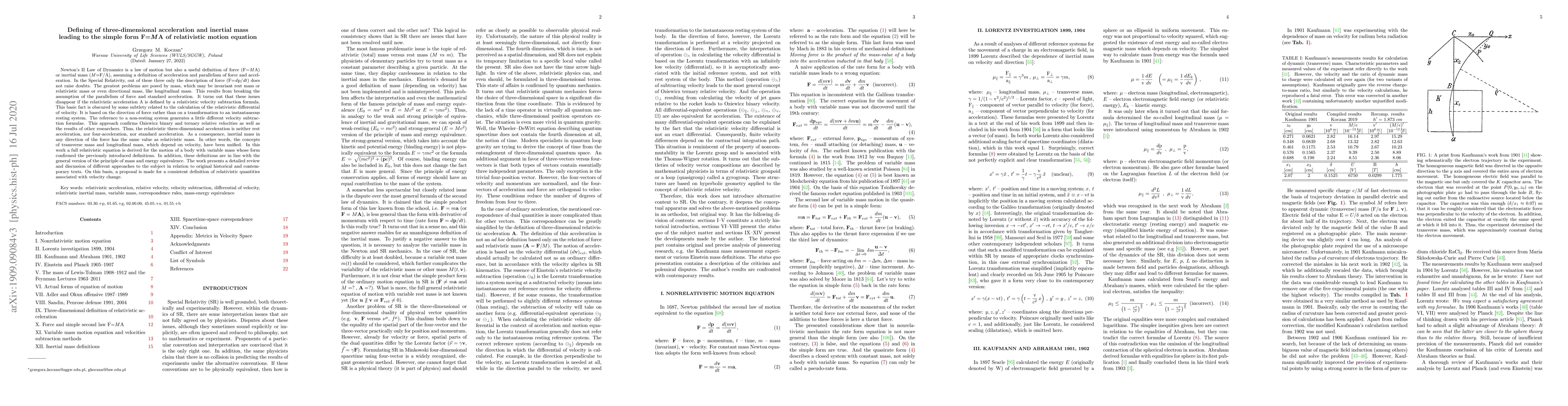 Newton second law of dynamics is a law of motion but also a useful definition of force (F=MA) or inertial mass (M=F/A), assuming a definition of acceleration and parallelism of force and acceleration. In the special theory of relativity, out of these three only the description of force (F=dp/dt) does not raise doubts. The greatest problems are posed by mass, which may be invariant rest mass or relativistic mass or even directional mass like longitudinal mass. This results from breaking the assumption of parallelism of force and standard acceleration. It turns out that these issues disappear if the relativistic acceleration A is defined as a relativistic velocity subtraction formula. This basic fact is obscured by some subtlety related to the calculation of the relativistic differential of velocity. It is based on the direction of force rather than on transformation to a resting system. The reference to a non-resting system generates a (seemingly) different velocity subtraction formula. Thus, the relativistic three-dimensional acceleration is neither rest acceleration, nor four-acceleration, nor standard acceleration. As a consequence, inertial mass in any direction of the force has the same value as relativistic mass. In other words, the concepts of transverse mass and longitudinal mass, which depend on velocity, have been unified. In this work a full relativistic equation is derived for the motion of a body with variable mass whose form confirmed the previously introduced definitions. In addition, these definitions are in line with the general version of the principle of mass and energy equivalence. The work presents a detailed review and discussion of different approaches to the subject in relation to original historical and contemporary texts. On this basis, a proposal is made for consistent definition of relativistic quantities associated with velocity change.