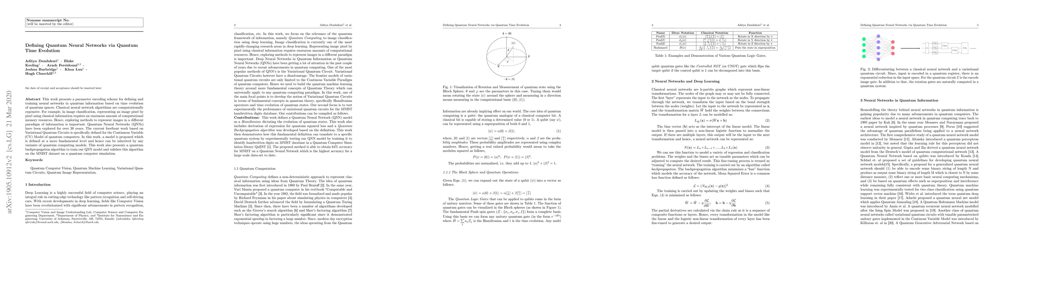 This work presents a novel fundamental algorithm for for defining and training Neural Networks in Quantum Information based on time evolution and the Hamiltonian. Classical Neural Network algorithms (ANN) are computationally expensive. For example, in image classification, representing an image pixel by pixel using classical information requires an enormous amount of computational memory resources. Hence, exploring methods to represent images in a different paradigm of information is important. Quantum Neural Networks (QNNs) have been explored for over 20 years. The current forefront work based on Variational Quantum Circuits is specifically defined for the Continuous Variable (CV) Model of quantum computers. In this work, a model is proposed which is defined at a more fundamental level and hence can be inherited by any variants of quantum computing models. This work also presents a quantum backpropagation algorithm to train our QNN model and validate this algorithm on the MNIST dataset on a quantum computer simulation.