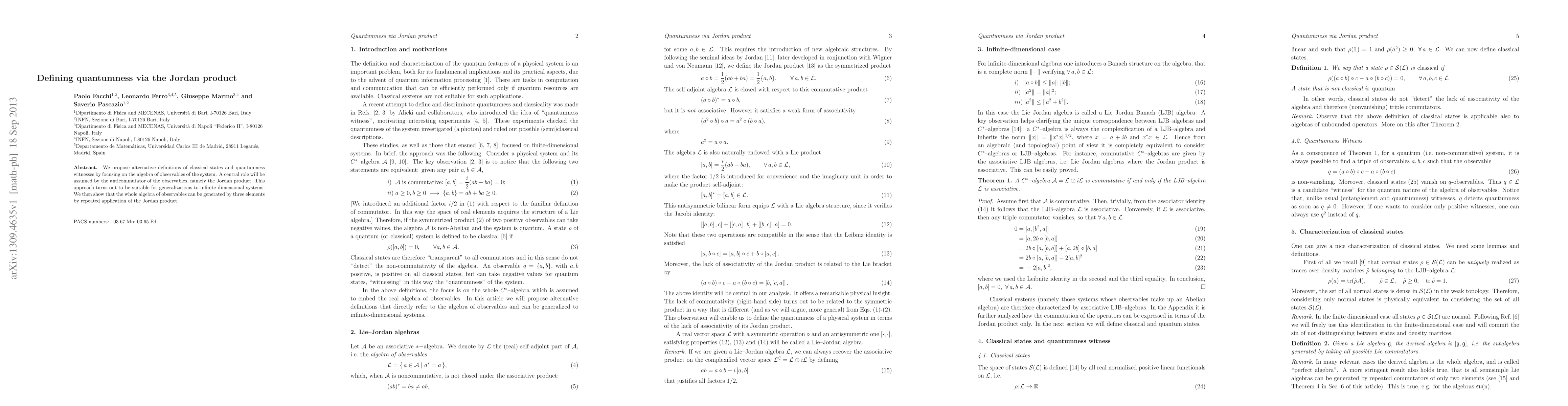 This paper proposes new definitions for classical states and quantumness witnesses using the Jordan product, which is the anticommutator of observables. It demonstrates that the entire algebra of observables can be generated by three elements through repeated application of the Jordan product, suitable for infinite dimensional systems.