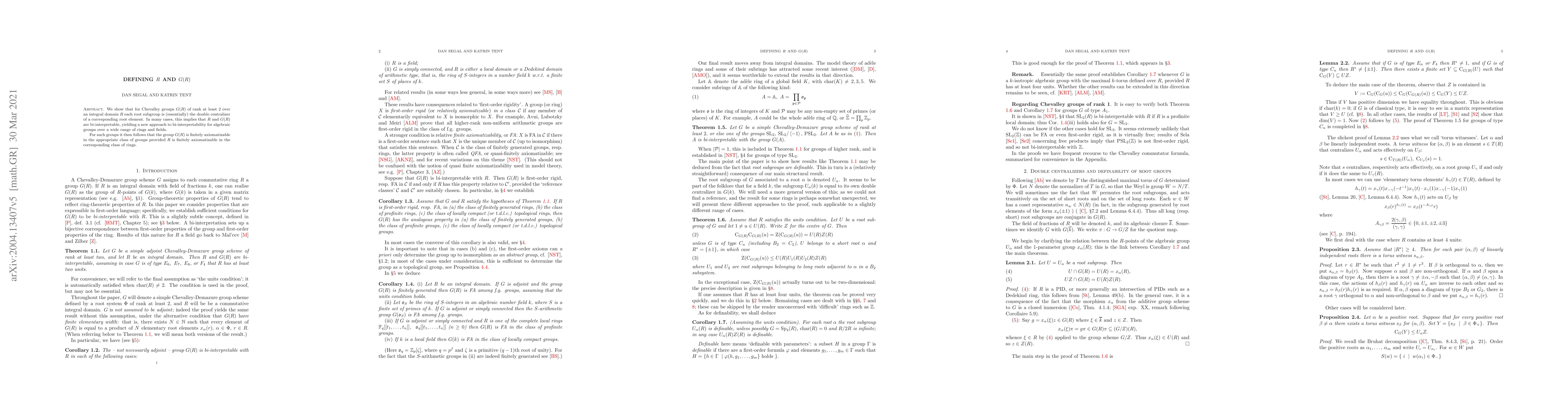 We show that for Chevalley groups G(R) of rank at least 2 over a ring R the root subgroups are essentially (nearly always) the double centralizers of corresponding root elements. In very many cases this implies that R and G(R) are bi-interpretable, yielding a new approach to bi-interpretability for algebraic groups over a wide range of rings and fields. For such groups it then follows that the group G(R) is finitely axiomatizable in the appropriate class of groups provided R is finitely axiomatizable in the corresponding class of rings.