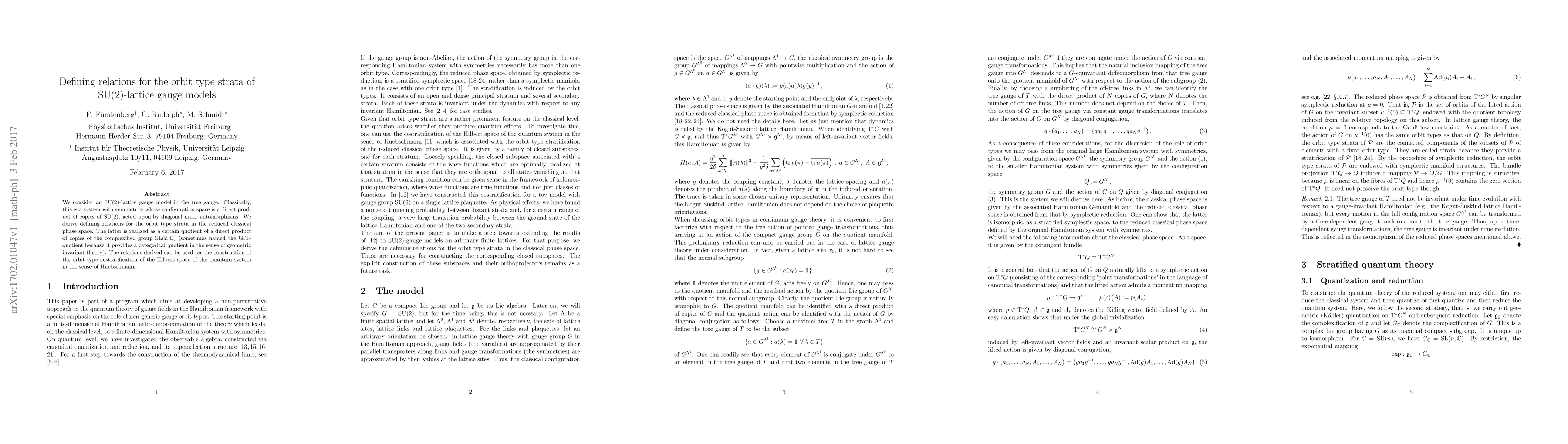 We consider an SU(2)-lattice gauge model in the tree gauge. Classically, this is a system with symmetries whose configuration space is a direct product of copies of SU(2), acted upon by diagonal inner automorphisms. We derive defining relations for the orbit type strata in the reduced classical phase space. The latter is realized as a certain quotient of a direct product of copies of the complexified group SL(2,\CC) (sometimes named the GIT-quotient because it provides a categorical quotient in the sense of geometric invariant theory). The relations derived can be used for the construction of the orbit type costratification of the Hilbert space of the quantum system in the sense of Huebschmann.