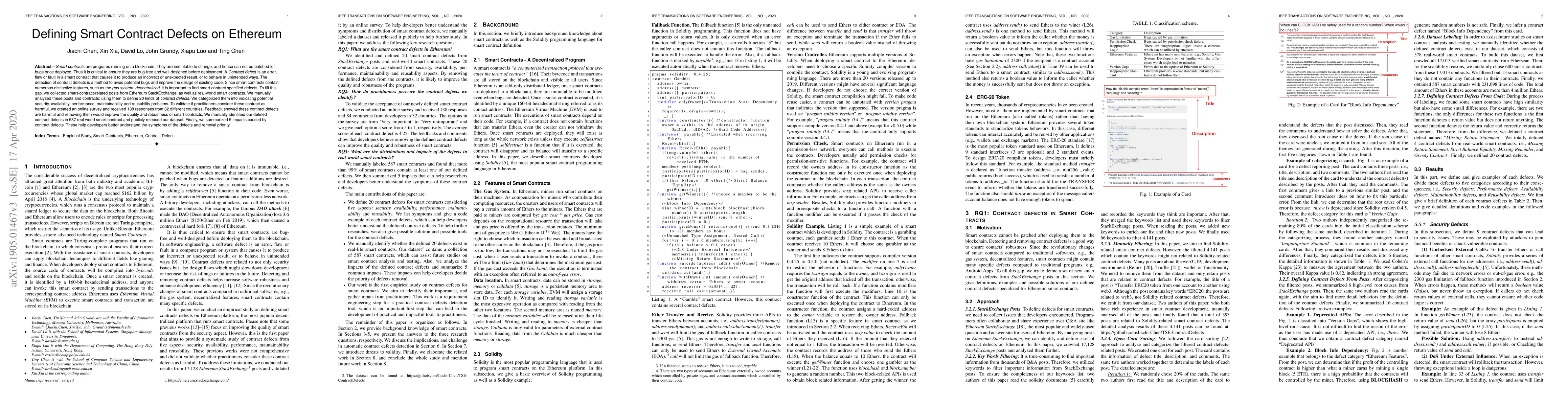 This paper identifies and categorizes 20 distinct smart contract defects on Ethereum, focusing on security, availability, performance, maintainability, and reusability issues. Through analysis of Ethereum StackExchange posts and real-world contracts, the study validates the significance of these defects via a global survey and highlights their impact on contract quality and robustness.