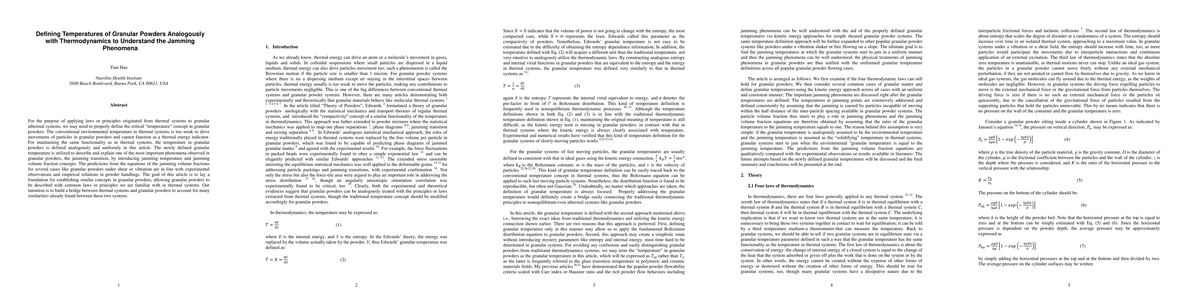 This paper defines granular temperature analogously to thermal systems to understand the jamming phenomena in granular powders, introducing jamming temperature and volume fraction concepts. The new granular temperature framework aligns with experimental observations and aims to bridge similarities between thermal and granular systems.