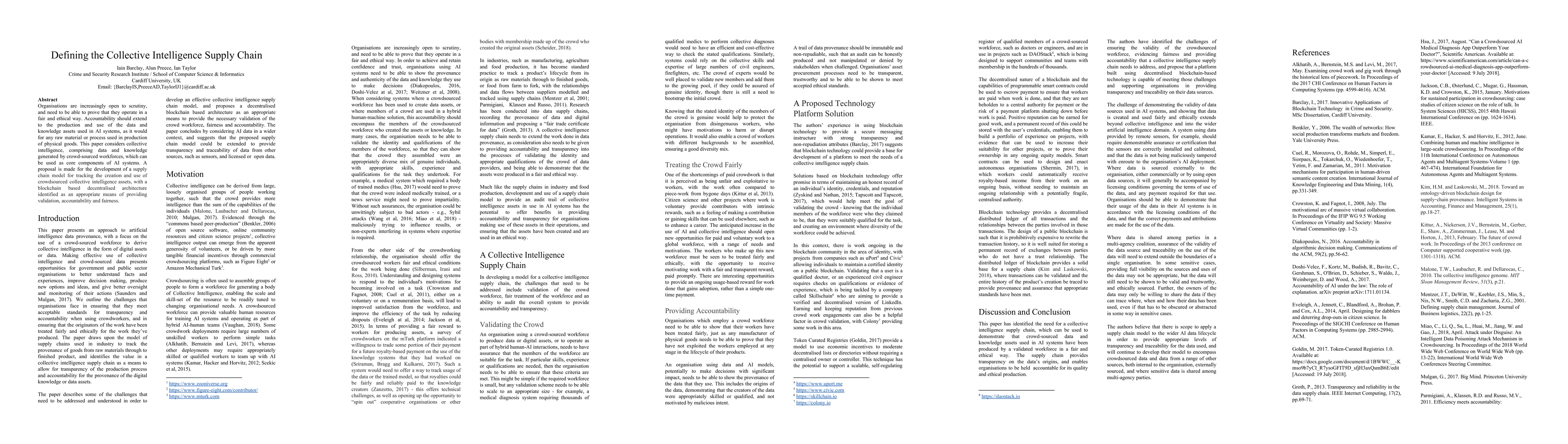 Organisations are increasingly open to scrutiny, and need to be able to prove that they operate in a fair and ethical way. Accountability should extend to the production and use of the data and knowledge assets used in AI systems, as it would for any raw material or process used in production of physical goods. This paper considers collective intelligence, comprising data and knowledge generated by crowd-sourced workforces, which can be used as core components of AI systems. A proposal is made for the development of a supply chain model for tracking the creation and use of crowdsourced collective intelligence assets, with a blockchain based decentralised architecture identified as an appropriate means of providing validation, accountability and fairness.