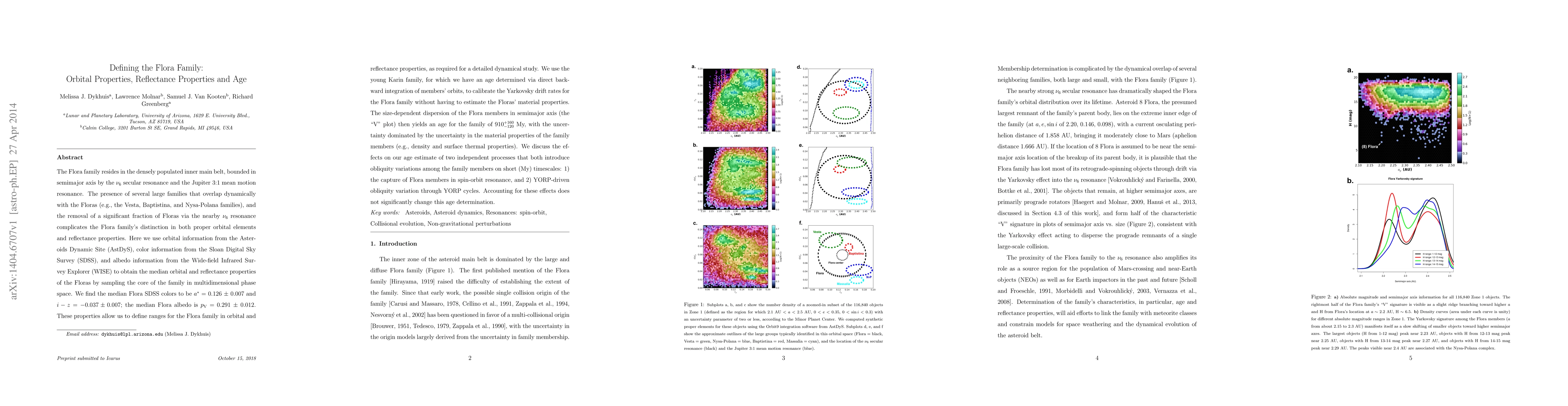 The Flora family resides in the densely populated inner main belt, bounded in semimajor axis by the $\nu_6$ secular resonance and the Jupiter 3:1 mean motion resonance. The presence of several large families that overlap dynamically with the Floras (e.g., the Vesta, Baptistina, and Nysa-Polana families), and the removal of a significant fraction of Floras via the nearby $\nu_6$ resonance complicates the Flora family's distinction in both proper orbital elements and reflectance properties. Here we use orbital information from the Asteroids Dynamic Site, color information from the Sloan Digital Sky Survey, and albedo information from the Wide-field Infrared Survey Explorer to obtain the median orbital and reflectance properties of the Floras by sampling the core of the family in multidimensional phase space. We find the median Flora SDSS colors to be $a^*$ = 0.126 $\pm$ 0.007 and $i-z = -0.037 \pm 0.007$; the median Flora albedo is $p_V$ = 0.291 $\pm$ 0.012. These properties allow us to define ranges for the Flora family in orbital and reflectance properties, as required for a detailed dynamical study. We use the young Karin family, for which we have an age determined via direct backward integration of members' orbits, to calibrate the Yarkovsky drift rates for the Flora family without having to estimate the Floras' material properties. The size-dependent dispersion of the Flora members in semimajor axis (the "V" plot) then yields an age for the family of $910^{+160}_{-120}$ My, with the uncertainty dominated by the uncertainty in the material properties of the family members (e.g., density and surface thermal properties). We discuss the effects on our age estimate of two independent processes that both introduce obliquity variations among the family members on short (My) timescales: 1) the capture of Flora members in spin-orbit resonance, and 2) YORP-driven obliquity variation.
