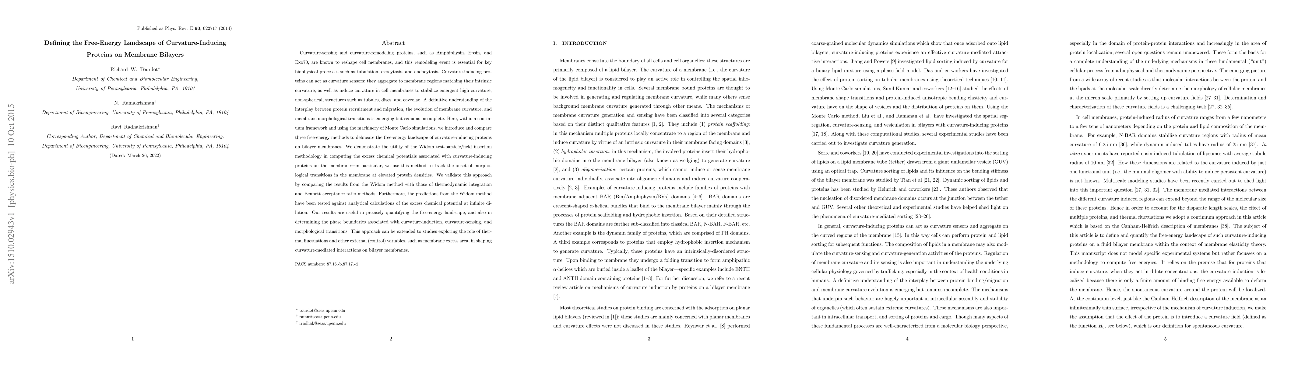 This paper introduces and compares three free-energy methods to define the free-energy landscape of curvature-inducing proteins on membrane bilayers, using Monte Carlo simulations. The Widom test-particle methodology is validated against thermodynamic integration and Bennett acceptance ratio methods, and is shown to accurately track morphological transitions in the membrane.