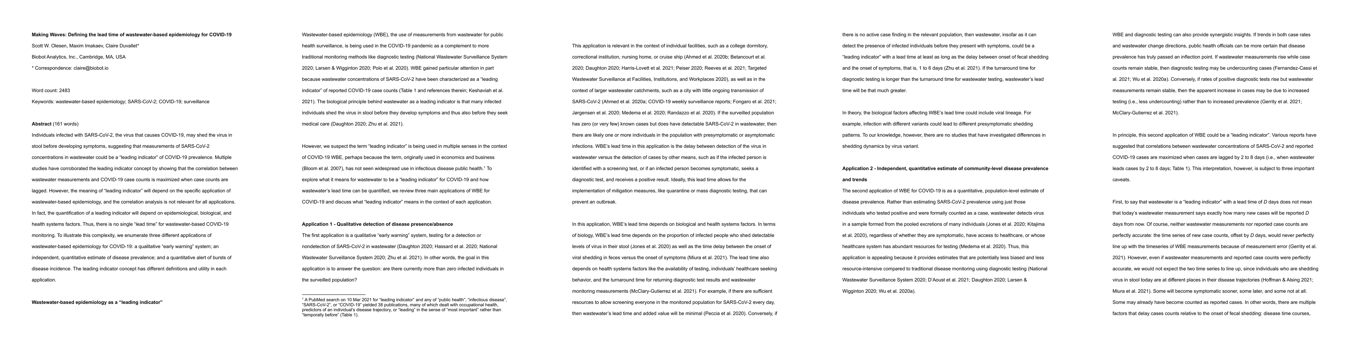 This study explores the variability in the "lead time" of wastewater-based epidemiology for COVID-19, emphasizing that the concept of a leading indicator differs across applications—from early warning systems to quantitative disease incidence alerts—depending on epidemiological and biological factors. No single lead time is applicable due to these varying definitions and utilities.