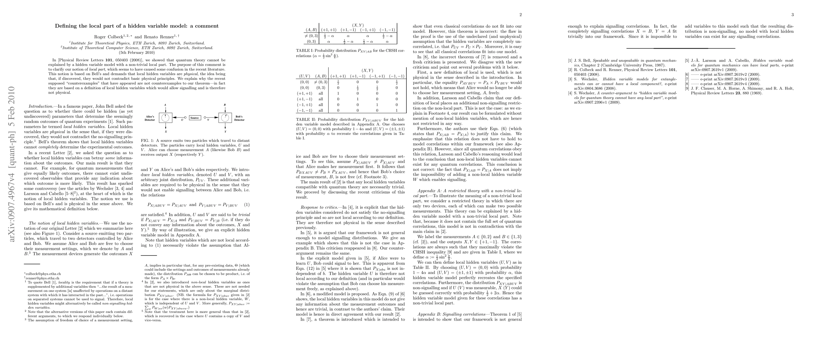In [Physical Review Letters 101, 050403 (2008)], we showed that quantum theory cannot be explained by a hidden variable model with a non-trivial local part. The purpose of this comment is to clarify our notion of local part, which seems to have caused some confusion in the recent literature. This notion is based on Bell's and demands that local hidden variables are physical, the idea being that, if discovered, they would not contradict basic physical principles. We explain why the recent supposed "counterexamples" that have appeared are not counterexamples to our theorem--in fact they are based on a definition of local hidden variables which would allow signalling and is therefore not physical.