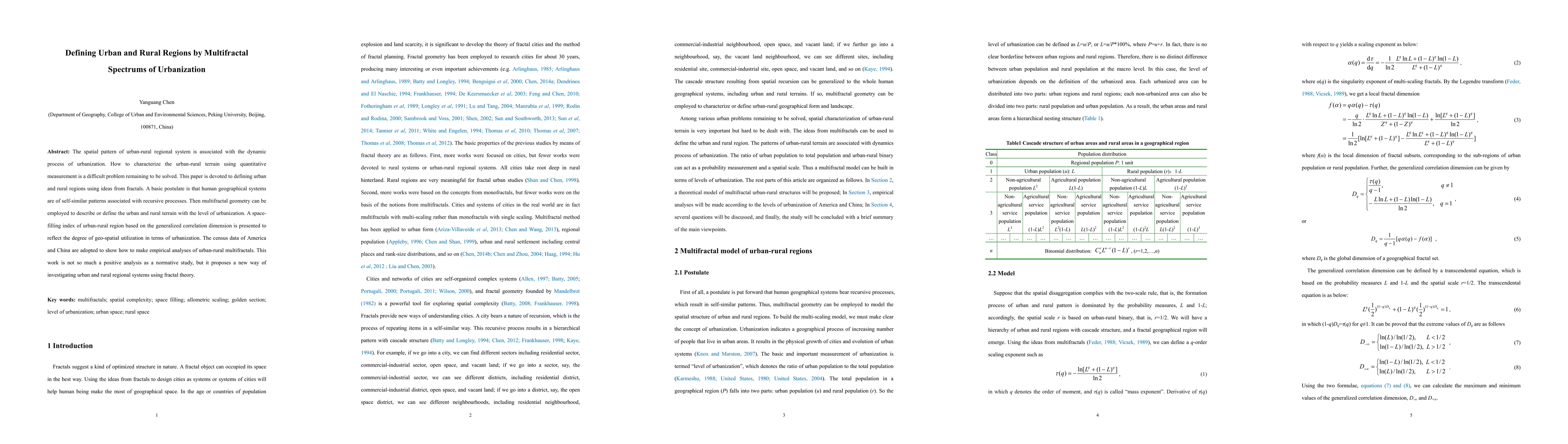 This paper proposes a method to define urban and rural regions using multifractal geometry to capture self-similar patterns in human geographical systems. It introduces a space-filling index based on generalized correlation dimension to measure geo-spatial utilization levels, illustrated with census data from America and China.