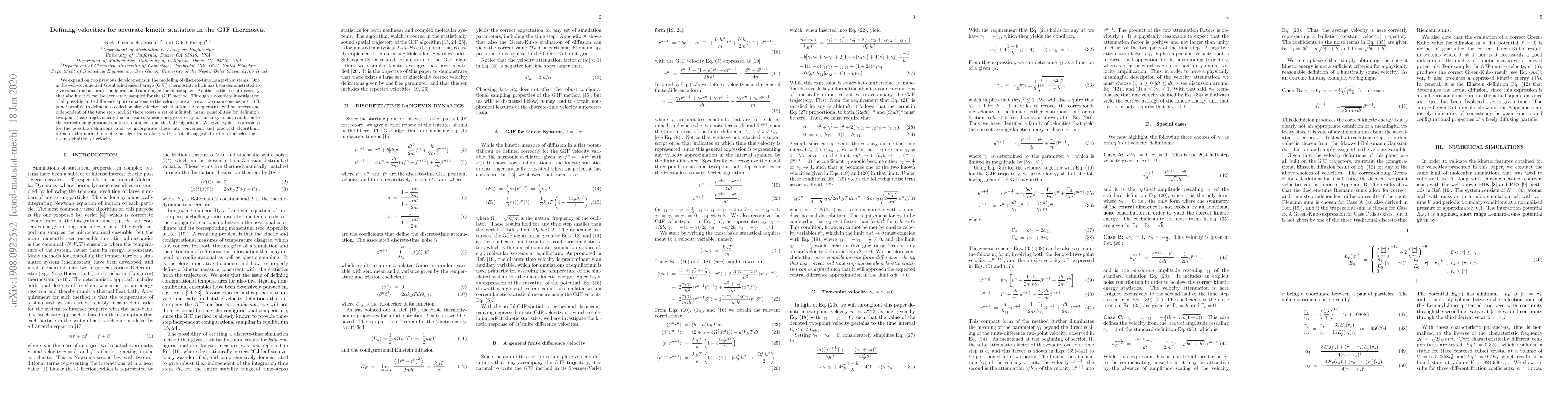 This paper investigates finite difference approximations for velocities in the GJF thermostat, concluding that no on-site velocity can maintain correct kinetic temperature across time steps, but a two-point velocity can accurately measure kinetic energy for linear systems, alongside the GJF's accurate configurational sampling.