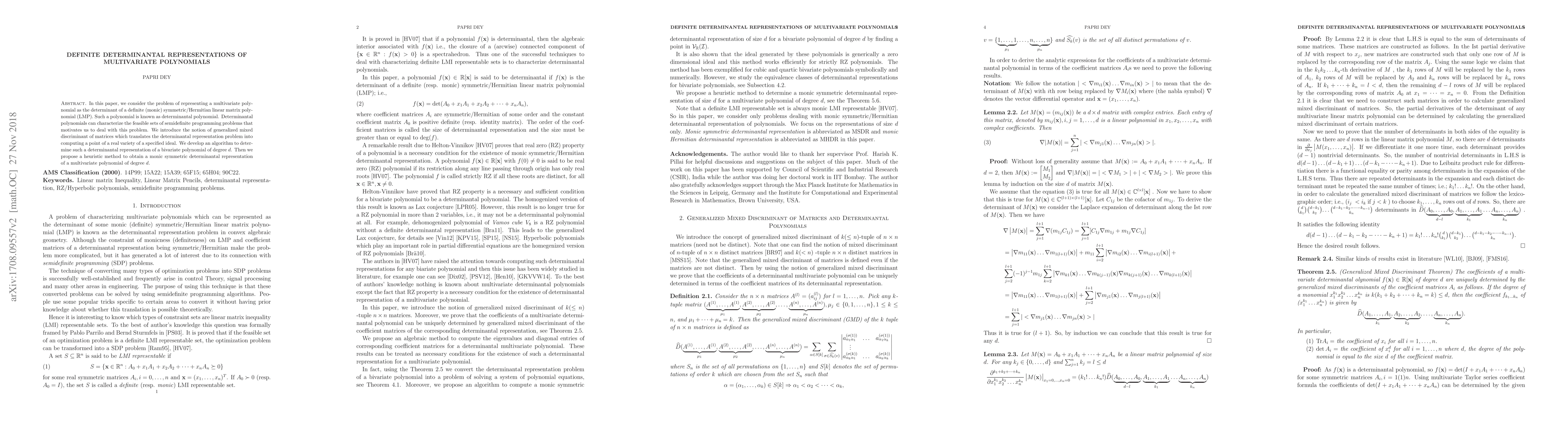 This paper explores representing multivariate polynomials as determinants of definite symmetric/Hermitian linear matrix polynomials, termed determinantal polynomials. It introduces a generalized mixed discriminant to solve this problem and develops an algorithm for bivariate polynomials, followed by a heuristic method for multivariate polynomials.