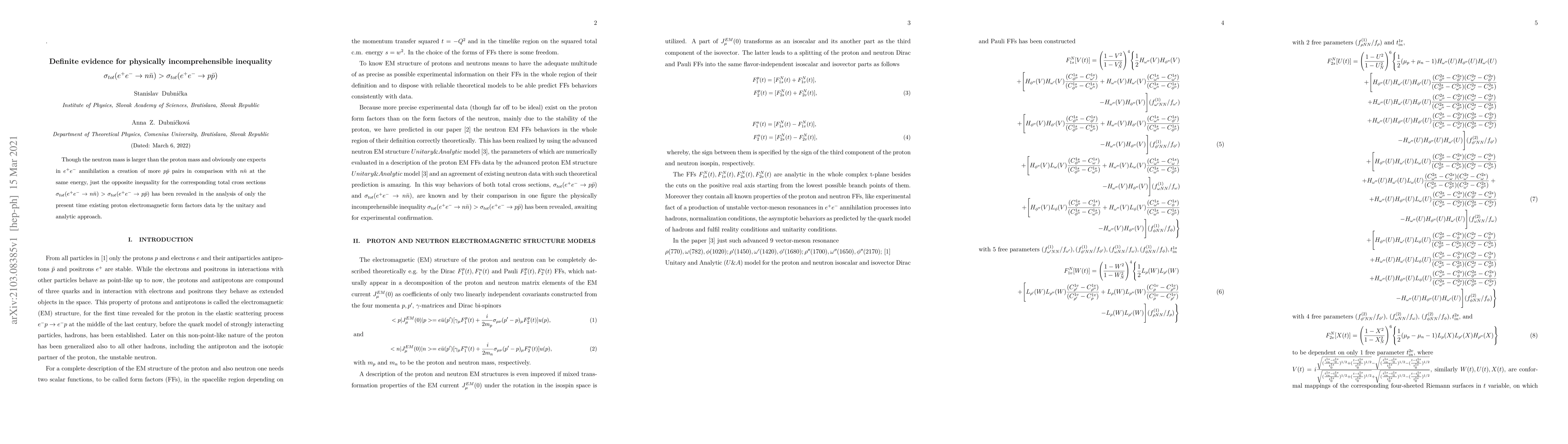 Though the neutron mass is larger than the proton mass and obviously one expects in $e^+e^-$ annihilation a creation of more $p \bar p$ pairs in comparison with $n \bar n$ at the same energy, just the opposite inequality for the corresponding total cross sections $\sigma_{tot}(e^+e^- \to n \bar n) > \sigma_{tot}(e^+e^- \to p \bar p)$ has been revealed in the analysis of only the present time existing proton electromagnetic form factors data by the unitary and analytic approach.