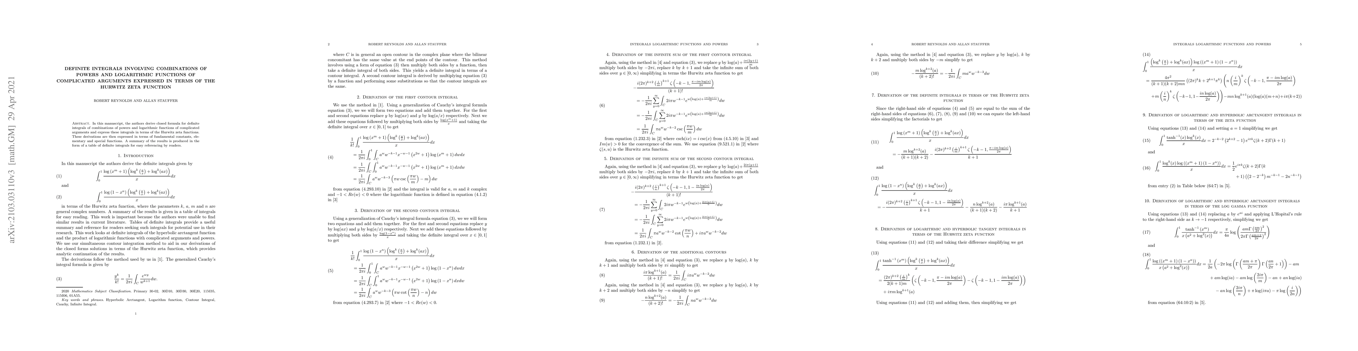 In this manuscript, the authors derive closed formula for definite integrals of combinations of powers and logarithmic functions of complicated arguments and express these integrals in terms of the Hurwitz zeta. These derivations are then expressed in terms of fundamental constants, elementary and special functions. A summary of the results is produced in the form of a table of definite integrals for easy referencing by readers.