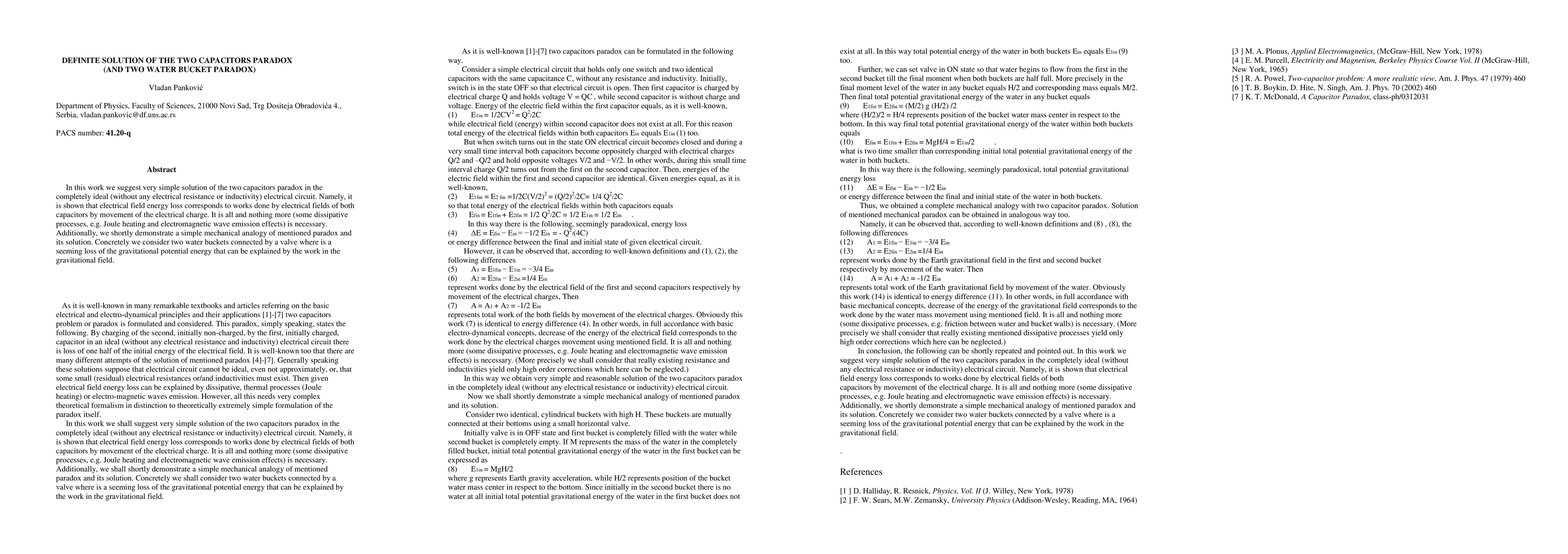 This paper resolves the two capacitors paradox by demonstrating that energy loss in the electrical field corresponds to work done by both capacitors' fields during charge movement, with no need for additional dissipation processes. It also provides a mechanical analogy using two water buckets to illustrate the concept of energy loss through gravitational field work.
