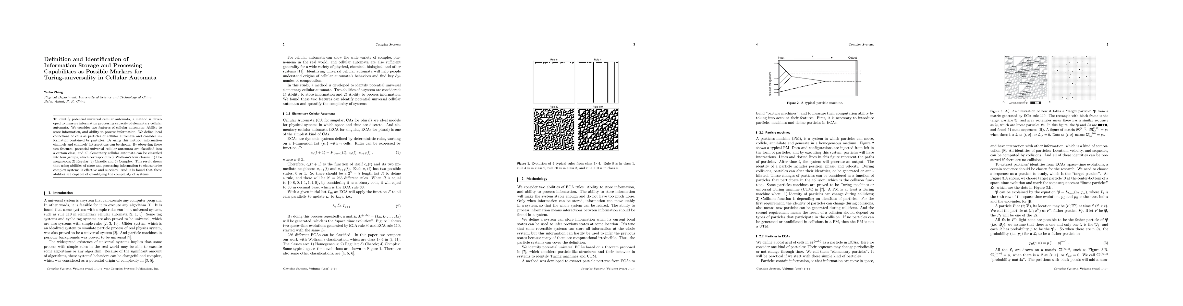 To identify potential universal cellular automata, a method is developed to measure information processing capacity of elementary cellular automata. We consider two features of cellular automata: Ability to store information, and ability to process information. We define local collections of cells as particles of cellular automata and consider information contained by particles. By using this method, information channels and channels' intersections can be shown. By observing these two features, potential universal cellular automata are classified into a certain class, and all elementary cellular automata can be classified into four groups, which correspond to S. Wolfram's four classes: 1) Homogeneous; 2) Regular; 3) Chaotic and 4) Complex. This result shows that using abilities of store and processing information to characterize complex systems is effective and succinct. And it is found that these abilities are capable of quantifying the complexity of systems.