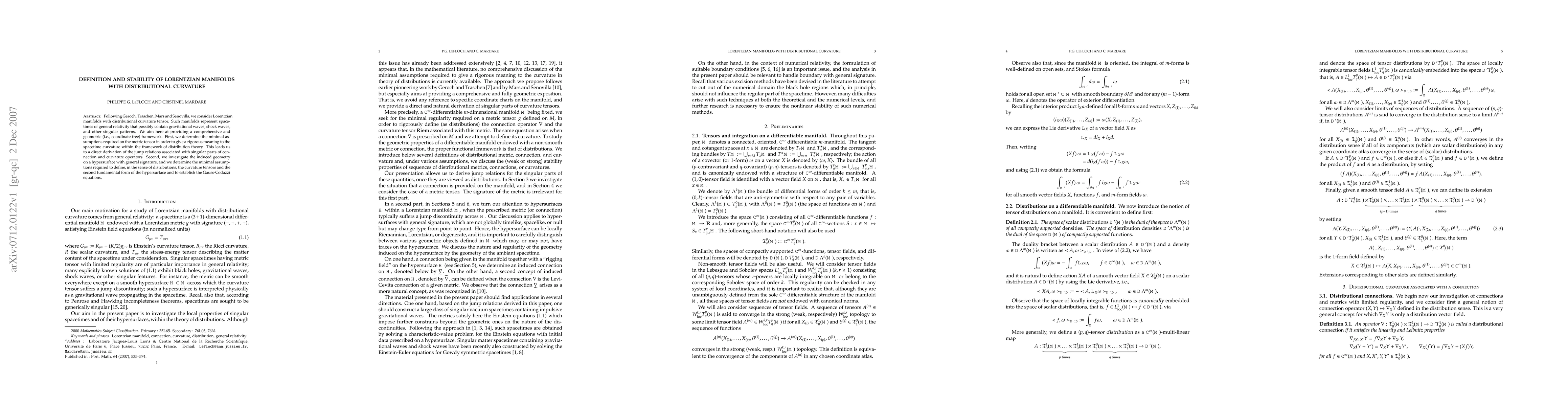 This paper develops a rigorous geometric framework for Lorentzian manifolds with distributional curvature, focusing on spacetimes with singularities like gravitational waves. It establishes minimal metric tensor assumptions for curvature interpretation and derives jump relations for singular connection and curvature, while also defining hypersurface curvature tensors and Gauss-Codazzi equations.