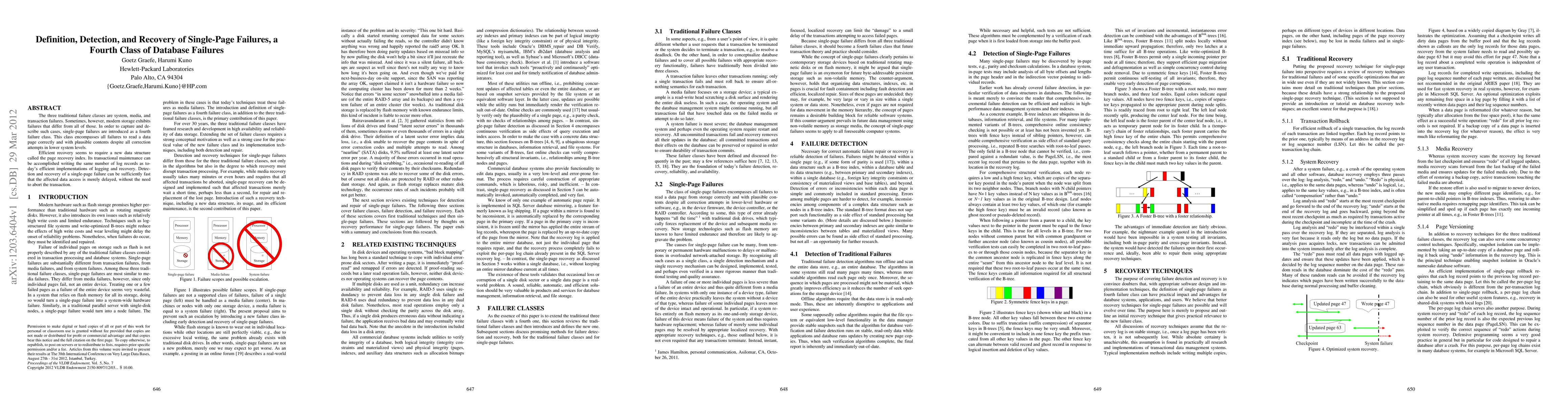 This paper introduces single-page failures as a fourth class of database failures, distinct from system, media, and transaction failures. It proposes a page recovery index for efficient detection and recovery, ensuring that transactions can proceed without aborts, merely delaying affected data access.