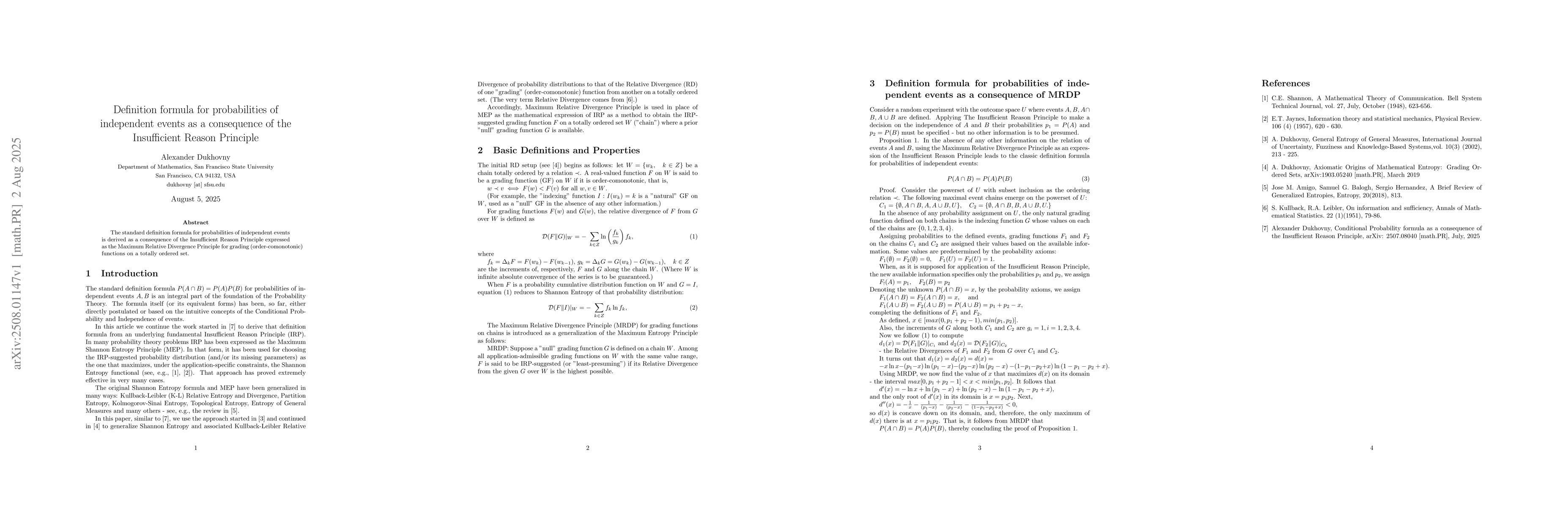 The standard definition formula for probabilities of independent events is derived as a consequence of the Insufficient Reason Principle expressed as the Maximum Relative Divergence Principle for grading (order-comonotonic) functions on a totally ordered set.