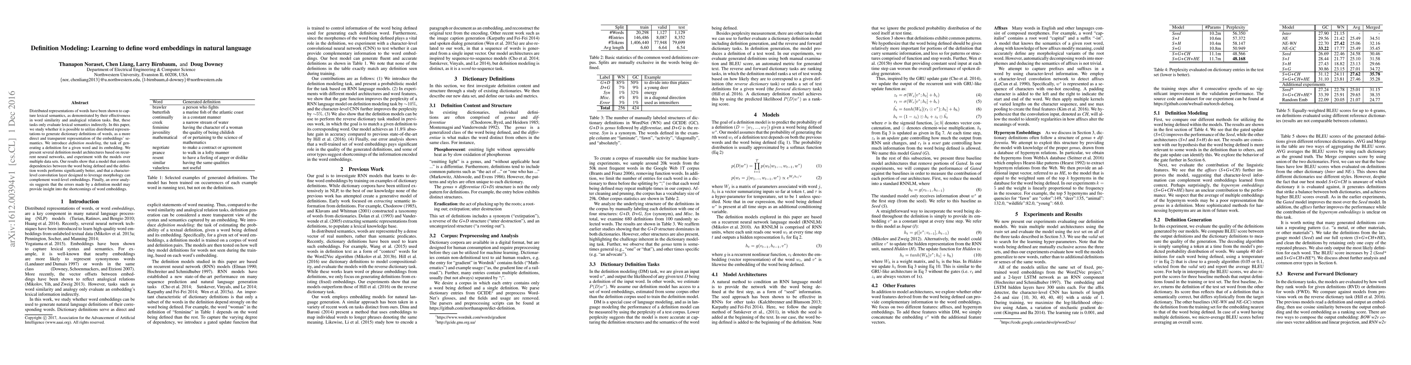This paper explores definition modeling, a task to generate dictionary definitions from word embeddings, aiming for a more direct representation of their semantics. The study introduces several definition model architectures based on recurrent neural networks, finding that models controlling dependencies between the defined word and definition words perform better, with character-level convolutions enhancing performance by leveraging morphology.