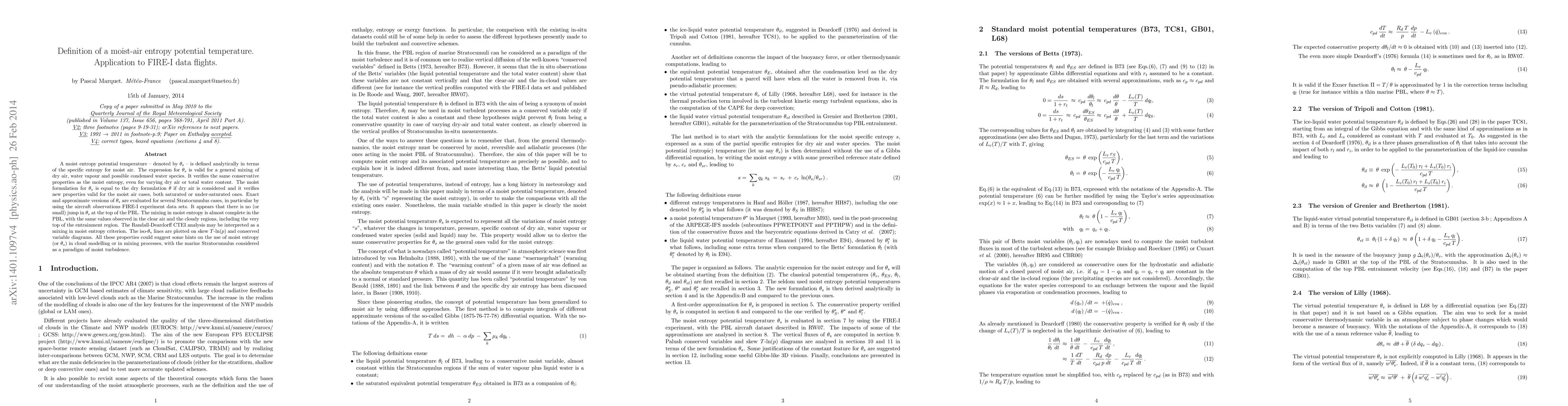 The paper defines a moist entropy potential temperature ${\theta}_{s}$ for moist air, showing it maintains conservative properties and is applicable in both saturated and under-saturated conditions. Using FIRE-I data, it finds minimal ${\theta}_{s}$ jumps at the PBL top, indicating complete mixing in moist entropy within the PBL, suggesting potential applications in cloud modeling and turbulence studies.