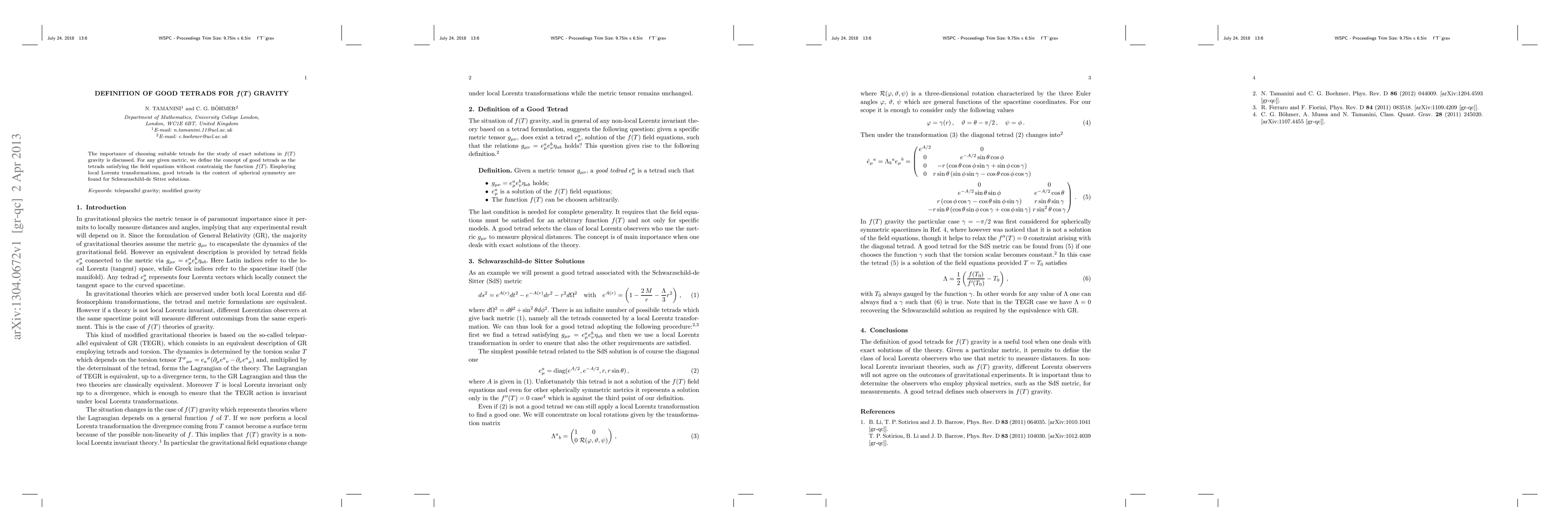 This paper defines "good tetrads" in f(T) gravity as those that satisfy the field equations without constraining the function f(T). It identifies good tetrads for spherical symmetry in Schwarzschild-de Sitter solutions using local Lorentz transformations.