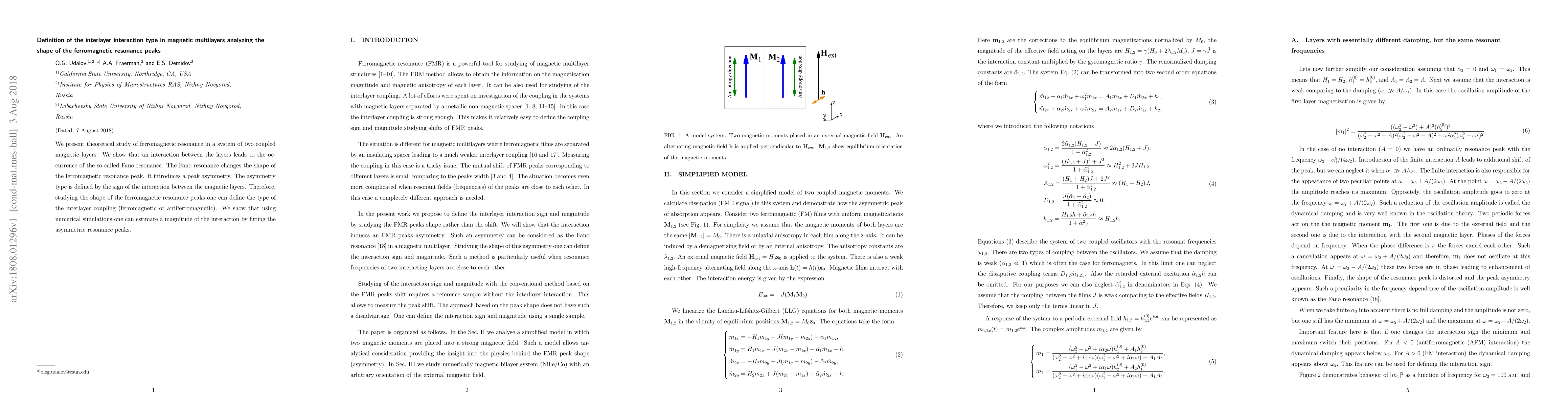 We present theoretical study of ferromagnetic resonance in a system of two coupled magnetic layers. We show that an interaction between the layers leads to the occurrence of the so-called Fano resonance. The Fano resonance changes the shape of the ferromagnetic resonance peak. It introduces a peak asymmetry. The asymmetry type is defined by the sign of the interaction between the magnetic layers. Therefore, studying the shape of the ferromagnetic resonance peaks one can define the type of the interlayer coupling (ferromagnetic or antiferromagnetic). We show that using numerical simulations one can estimate a magnitude of the interaction by fitting the asymmetric resonance peaks.