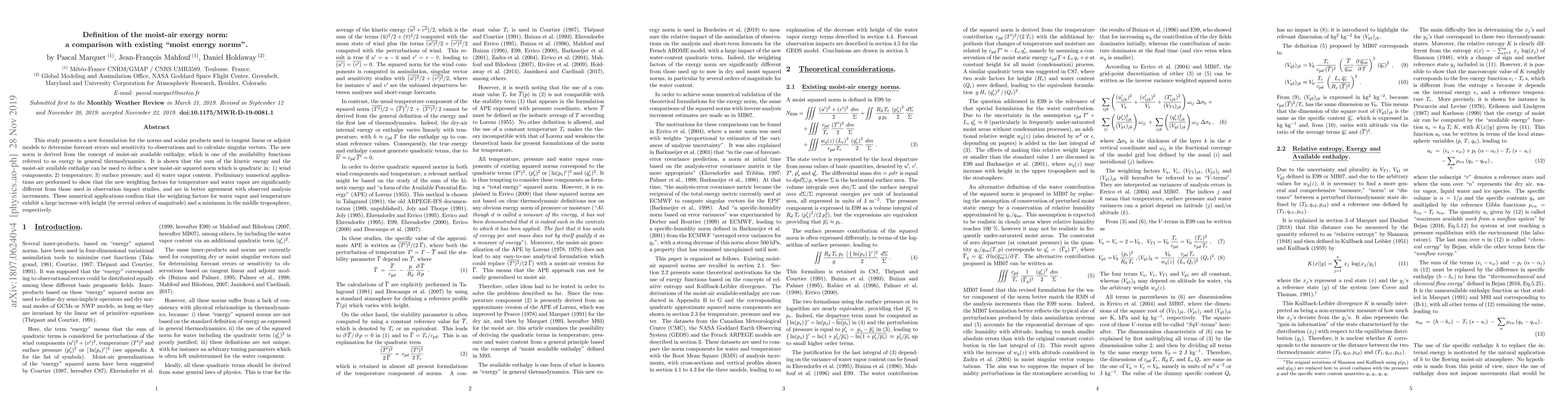 This study presents a new formulation for the norms and scalar products used in tangent linear or adjoint models to determine forecast errors and sensitivity to observations and to calculate singular vectors. The new norm is derived from the concept of moist-air available enthalpy, which is one of the availability functions referred to as exergy in general thermodynamics. It is shown that the sum of the kinetic energy and the moist-air available enthalpy can be used to define a new moist-air squared norm which is quadratic in: 1) wind components; 2) temperature; 3) surface pressure; and 4) water vapor content. Preliminary numerical applications are performed to show that the new weighting factors for temperature and water vapor are significantly different from those used in observation impact studies, and are in better agreement with observed analysis increments. These numerical applications confirm that the weighting factors for water vapor and temperature exhibit a large increase with height (by several orders of magnitude) and a minimum in the middle troposphere, respectively.