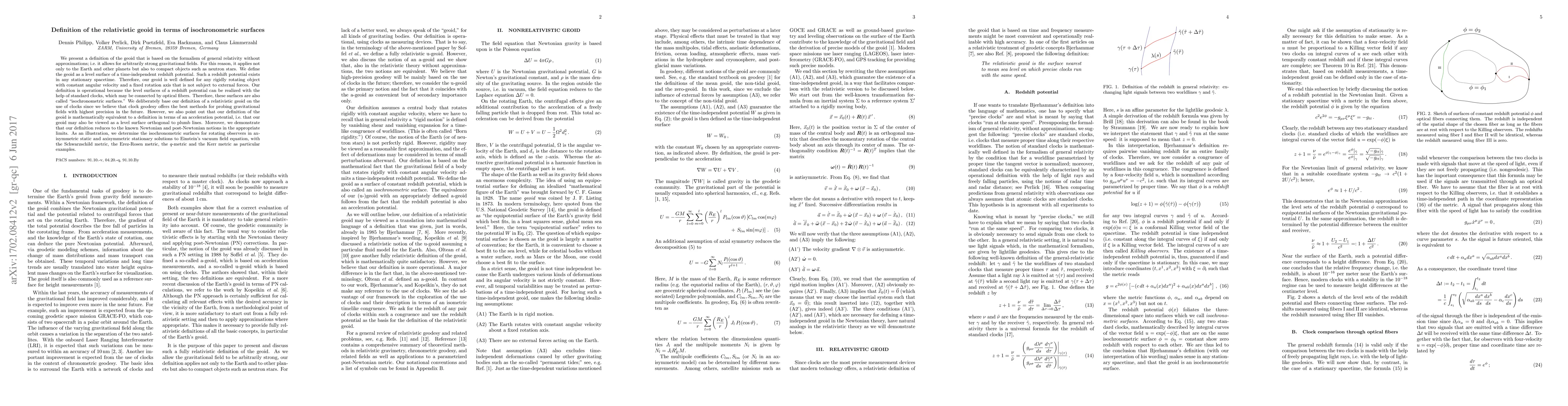 This paper defines the relativistic geoid based on general relativity, using a time-independent redshift potential in stationary spacetimes. It applies to various celestial bodies, including neutron stars, and is operational via isochronometric surfaces, realized with standard clocks.