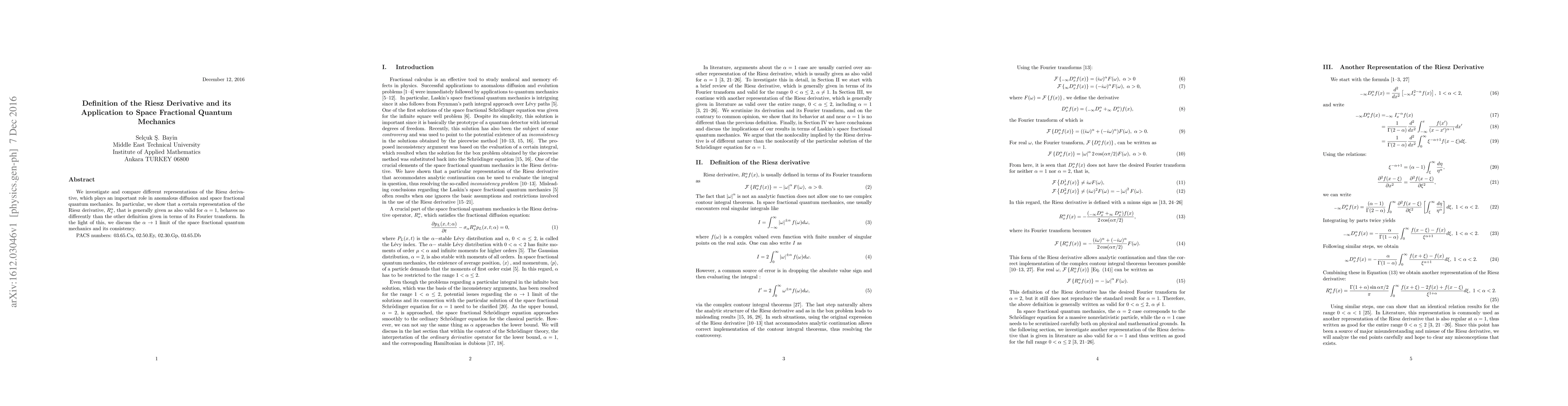 Researchers investigated different representations of the Riesz derivative in space fractional quantum mechanics, finding that a specific definition behaves similarly to another when alpha approaches 1.