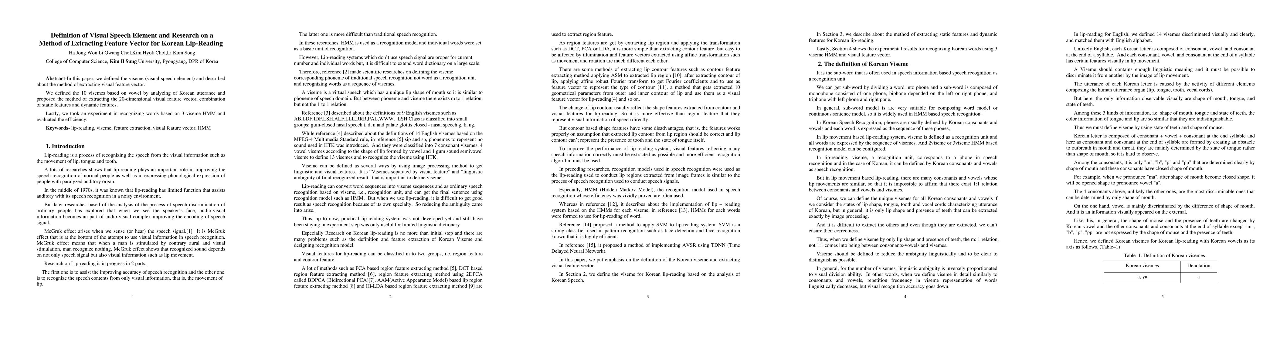 In this paper, we defined the viseme (visual speech element) and described about the method of extracting visual feature vector. We defined the 10 visemes based on vowel by analyzing of Korean utterance and proposed the method of extracting the 20-dimensional visual feature vector, combination of static features and dynamic features. Lastly, we took an experiment in recognizing words based on 3-viseme HMM and evaluated the efficiency.