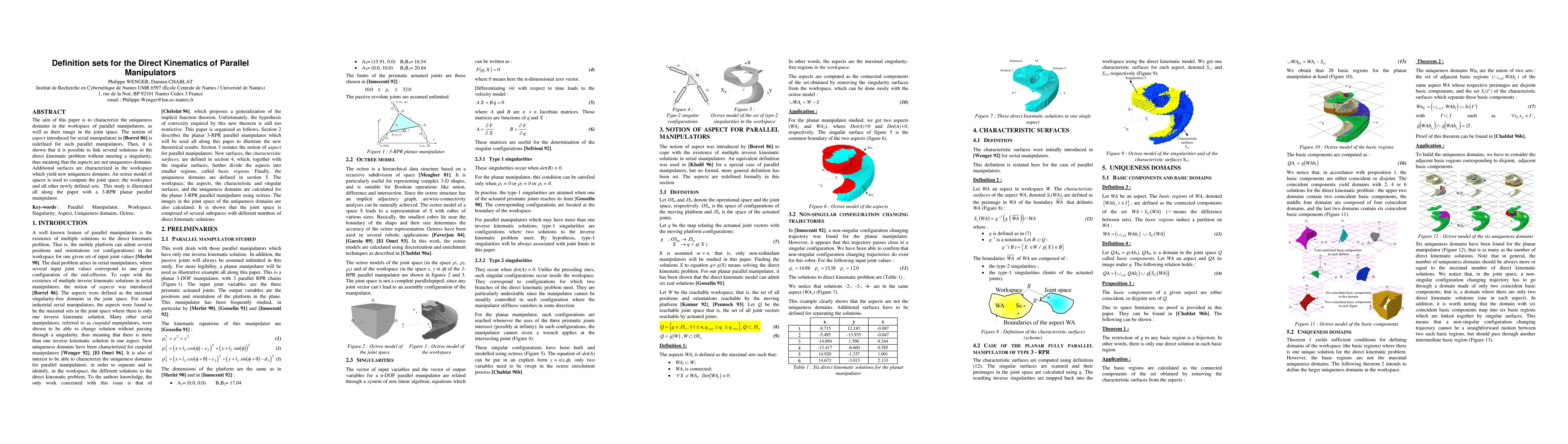 This paper redefines the concept of "aspect" for parallel manipulators to characterize uniqueness domains in their workspace, demonstrating that aspects are not always uniqueness domains. It also introduces additional surfaces in the workspace that create new uniqueness domains, utilizing an octree model to compute these spaces and illustrated with a 3-RPR planar parallel manipulator.