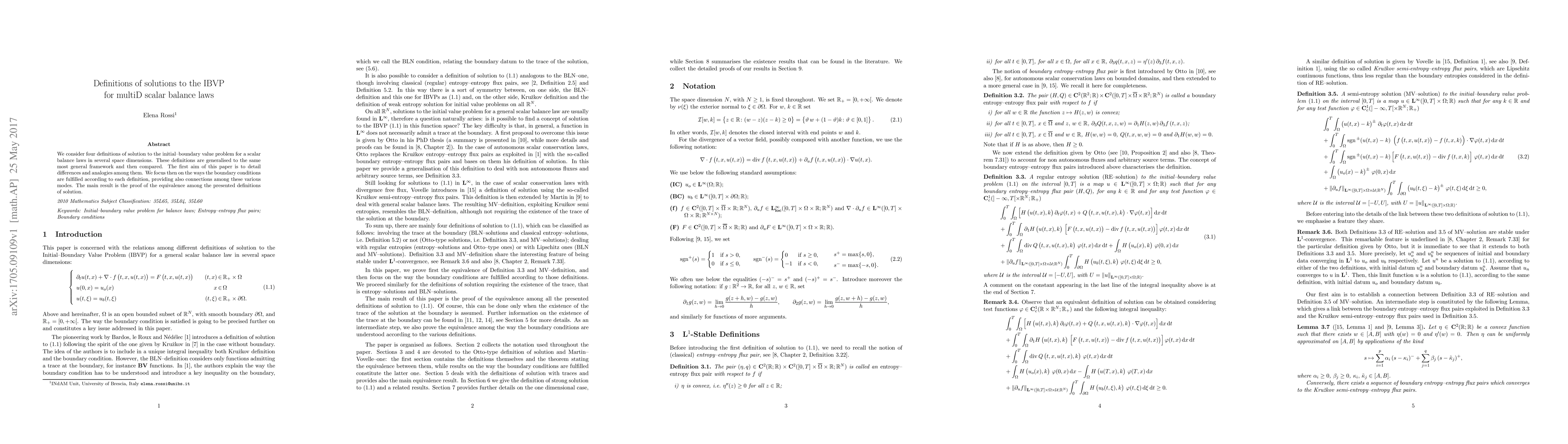 We consider four definitions of solution to the initial-boundary value problem for a scalar balance laws in several space dimensions. These definitions are generalised to the same most general framework and then compared. The first aim of this paper is to detail differences and analogies among them. We focus then on the ways the boundary conditions are fulfilled according to each definition, providing also connections among these various modes. The main result is the proof of the equivalence among the presented definitions of solution.