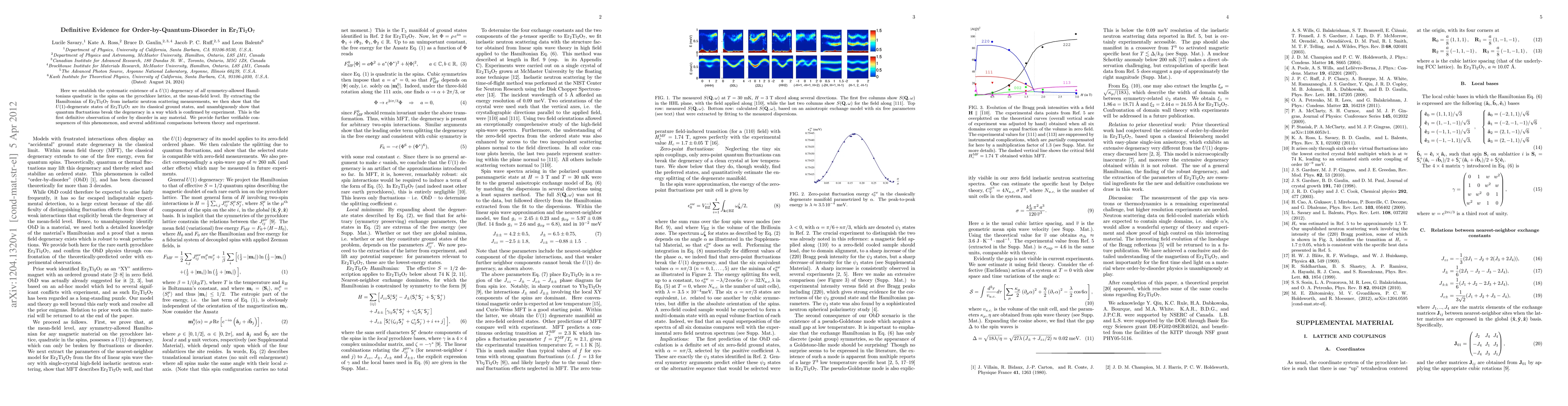 This paper establishes the existence of a U(1) degeneracy in the Hamiltonian of Er2Ti2O7, confirming through neutron scattering that quantum fluctuations break this degeneracy, marking the first definitive evidence of order-by-quantum-disorder in any material. Experimental results align with theoretical predictions, providing verifiable consequences of this phenomenon.
