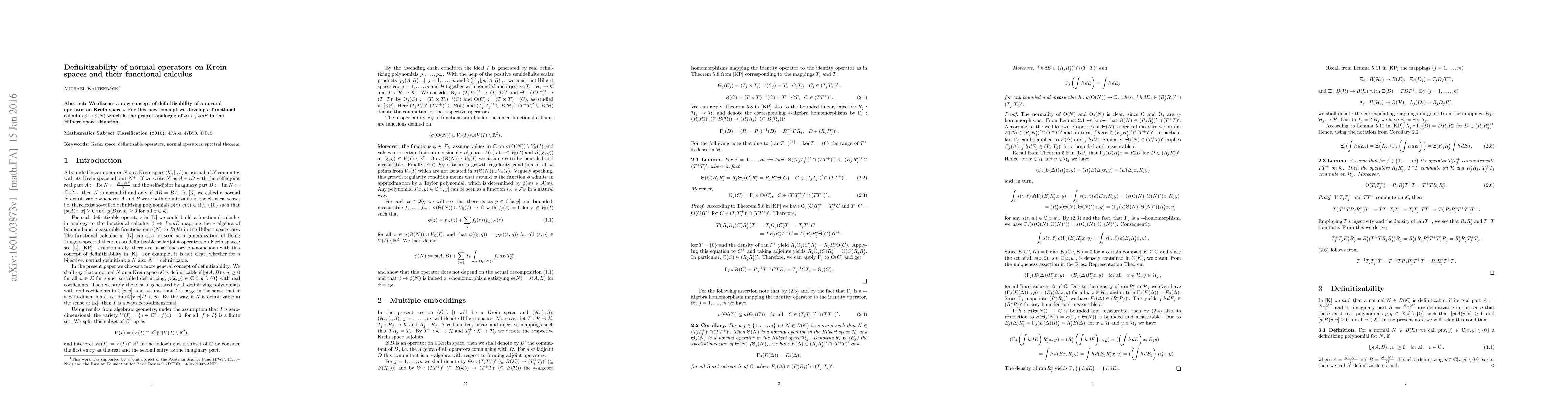 Summary: This paper introduces a novel concept of definitizability for normal operators on Krein spaces and develops a corresponding functional calculus, $\phi \mapsto \phi(N)$, analogous to the Hilbert space integral functional calculus.