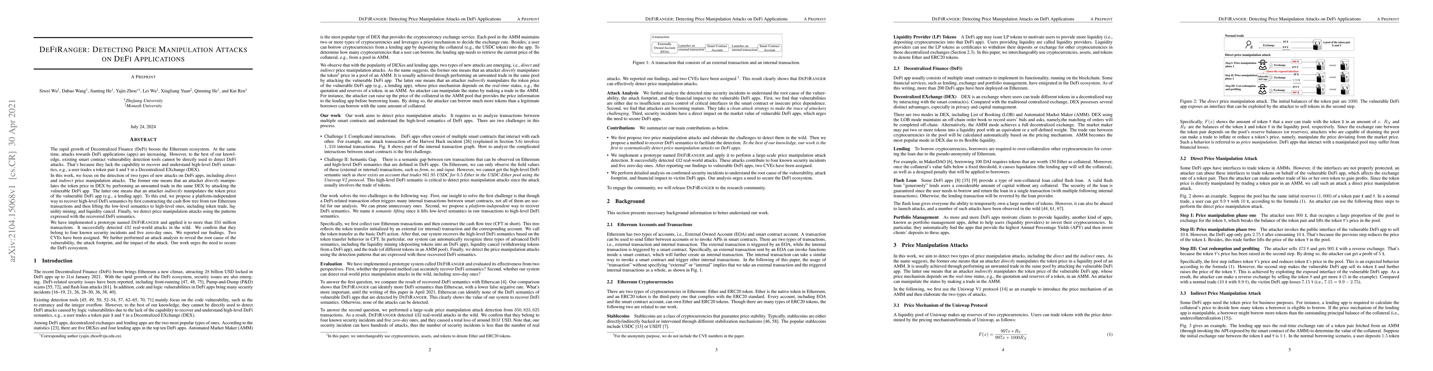 A new tool, DeFiRanger, detects price manipulation attacks on decentralized finance applications with high accuracy, identifying 432 real-world attacks in over 350 million transactions.