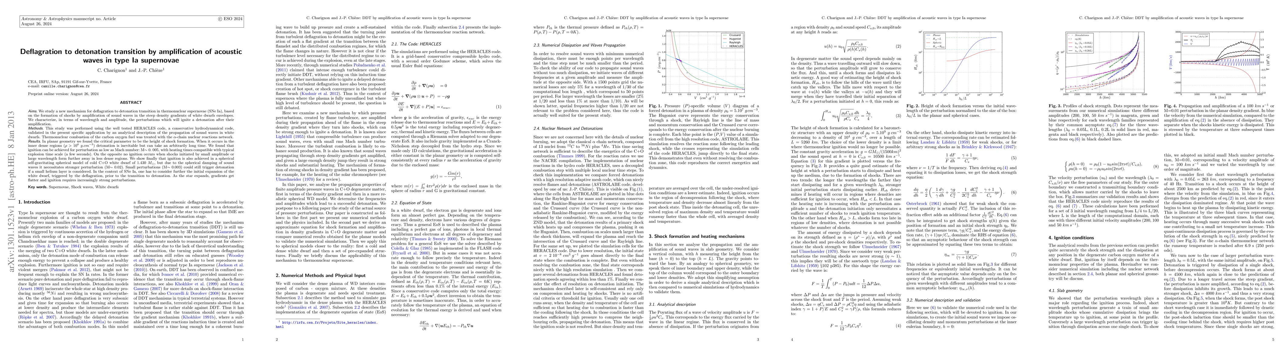 This paper proposes a new mechanism for deflagration to detonation transition in Type Ia supernovae, where sound waves amplified in white dwarf envelopes can form shocks and initiate detonations. The study shows that even small perturbations can lead to detonations under certain conditions, suggesting a potential pathway for such transitions in supernovae.