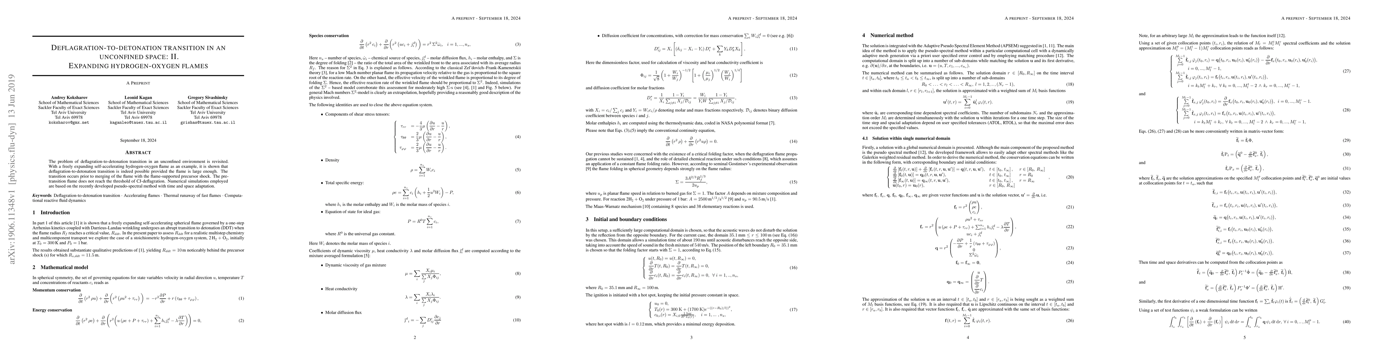 This paper investigates the deflagration-to-detonation transition in an unconfined hydrogen-oxygen flame, demonstrating that a sufficiently large flame can undergo this transition before merging with a precursor shock. Numerical simulations use a pseudo-spectral method with adaptive time and space refinement.