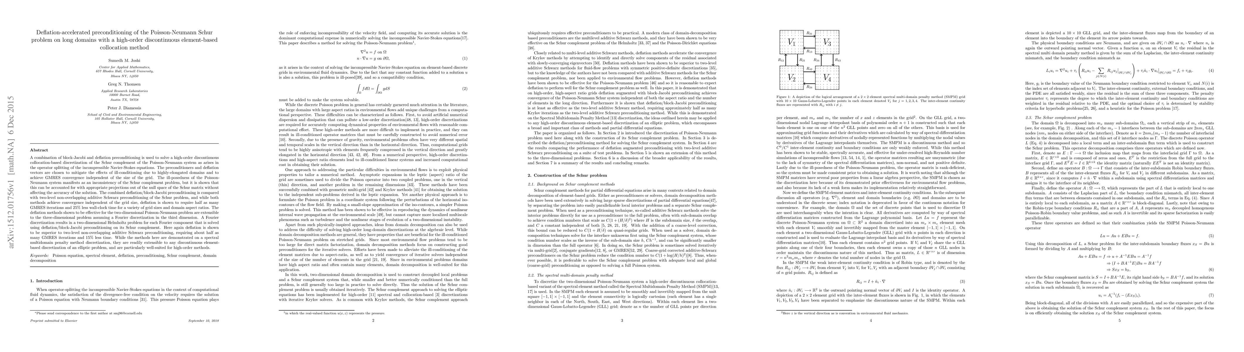 This paper proposes a deflation-accelerated preconditioning method combining block-Jacobi and deflation techniques to solve the Schur complement of the Poisson-Neumann system, achieving GMRES convergence independent of grid size. The method requires fewer iterations and less wall-clock time compared to additive Schwarz preconditioning.